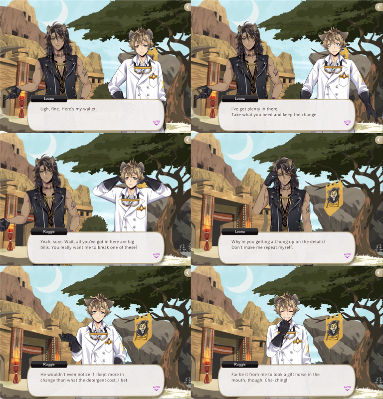 Ruggie reflects, “He wouldn’t even notice if I kept more in change than what the detergent cost, I bet. Far be it from me to look a gift horse in the mouth, though,” seemingly unaware that he this opportunity to help himself to Leona’s wallet may have been an intentional move on Leona’s part.