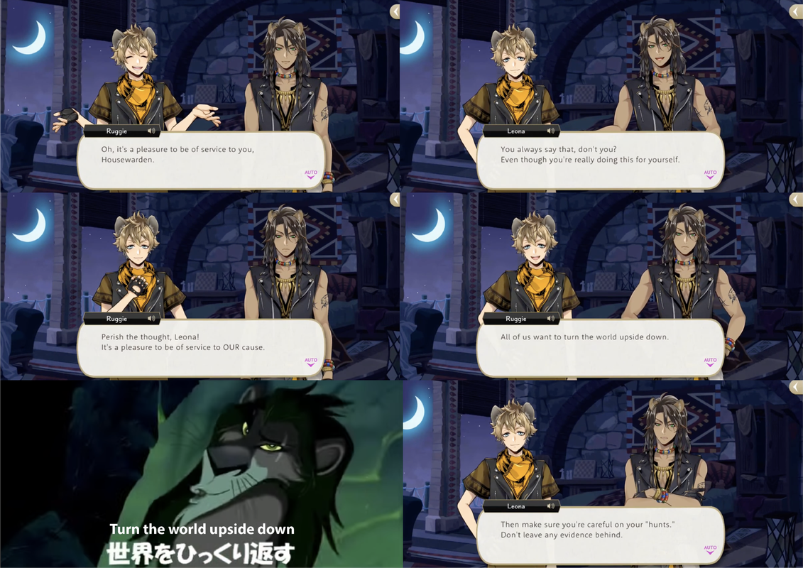 When Leona comments on how Ruggie is really doing everything for himself Ruggie insists that it is for their cause, together, saying, “All of us want to turn the world upside down.” This is possibly a reference to the JP-language adaptation of Scar’s song, “Be Prepared,” which includes the line “turn the world upside down.”