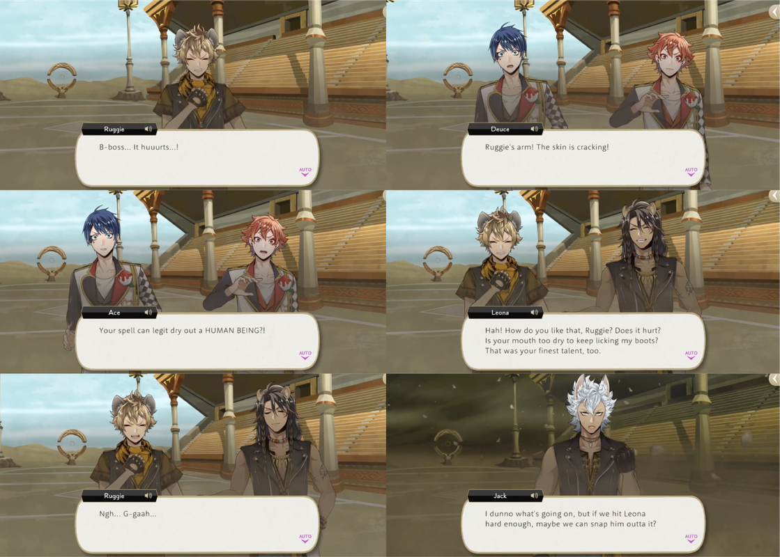 Ruggie insists that Leona cannot quit and Leona turns on him with his unique magic, mocking him for licking his boots. An injured Ruggie later insists on joining the fight against an overblotted Leona, saying that he will not take Leona’s insults lying down. (Leona: “So even the lowly hyena turns against me?”)
