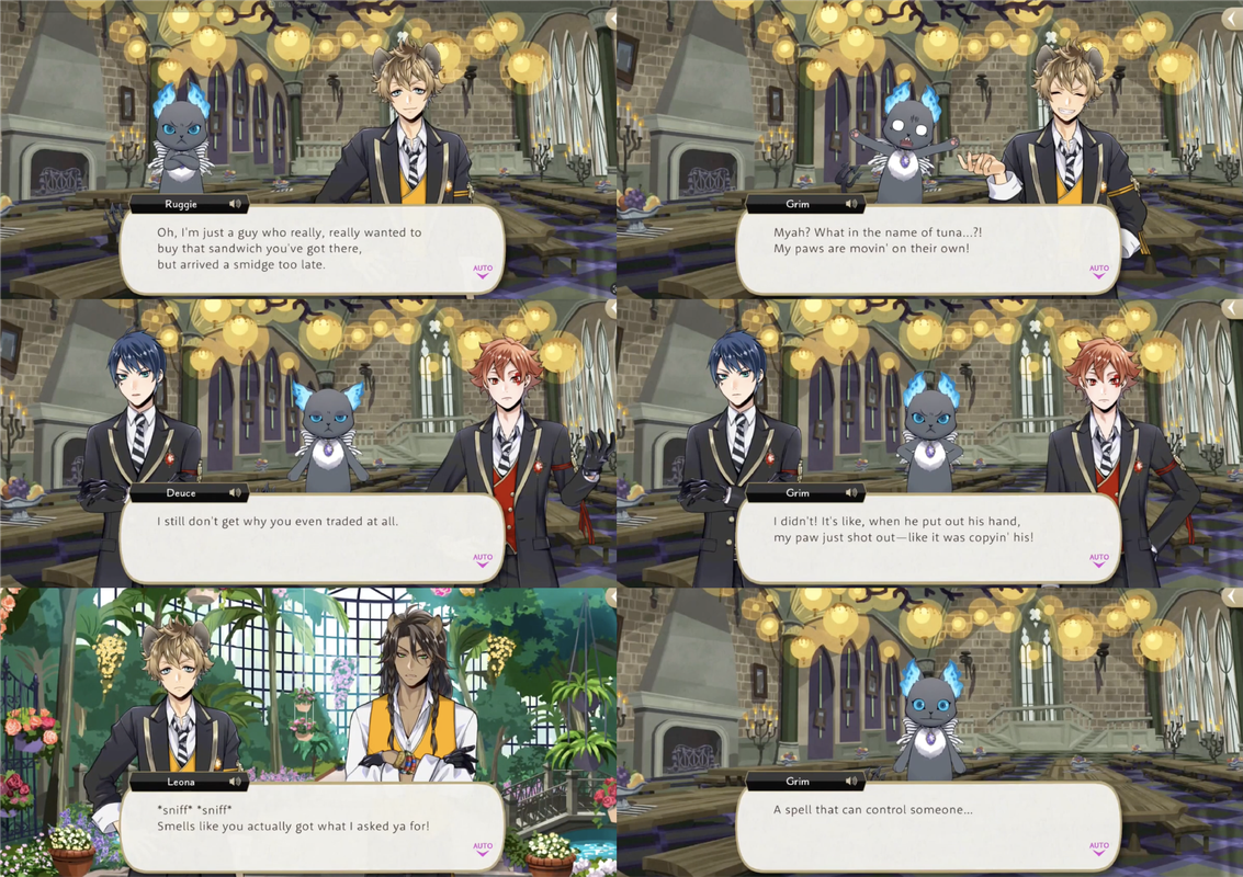 Ruggie uses his unique magic on Grim in Book 2 in order to acquire a sandwich for Leona, which ultimately leads to Leona’s downfall: Grim is then able to connect someone having the ability to control others’ movements to Ruggie, which connects directly to Heartslabyul, Diasomnia and Jack putting together the plan that compromises Savanaclaw’s attempts to sabotage the interdorm spelldrive tournament.