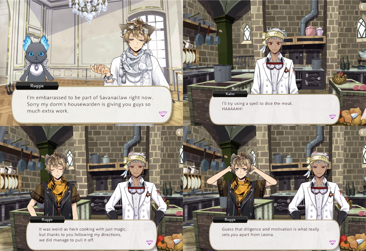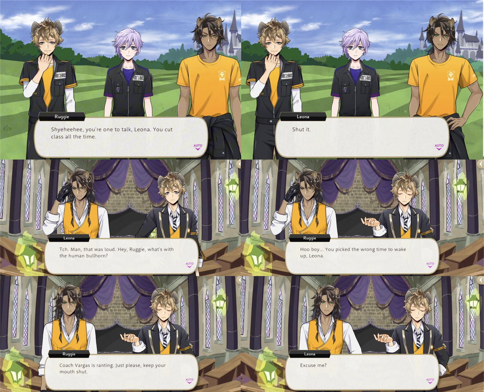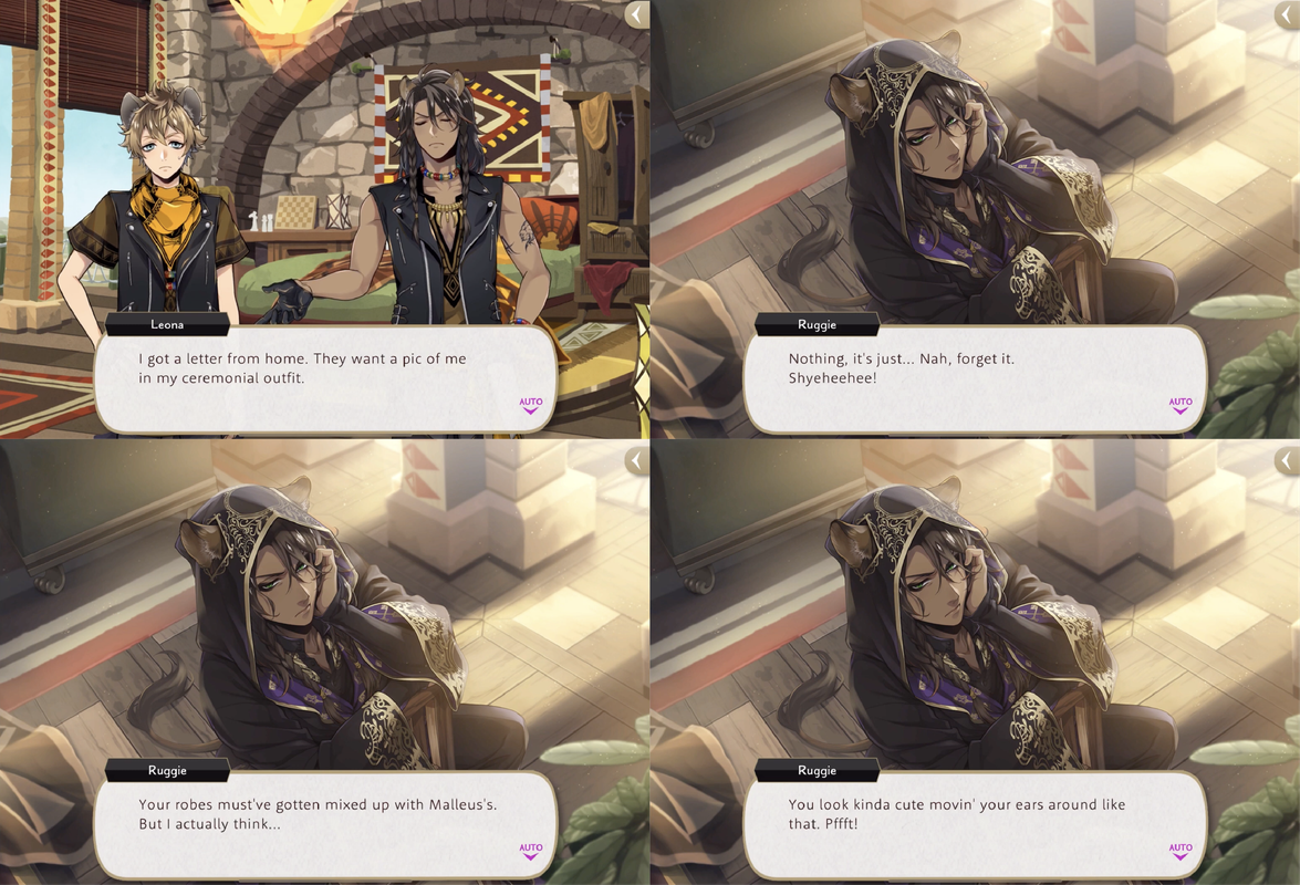 Ruggie also teases Leona about Cheka, tells Leona that he is a “pampered prince” who cannot tie his own shoes, dismisses Kalim’s praise of Leona’s Fairy Gala performance, teases Leona about ditching classes and tell Leona to keep his mouth shut at a school assembly.