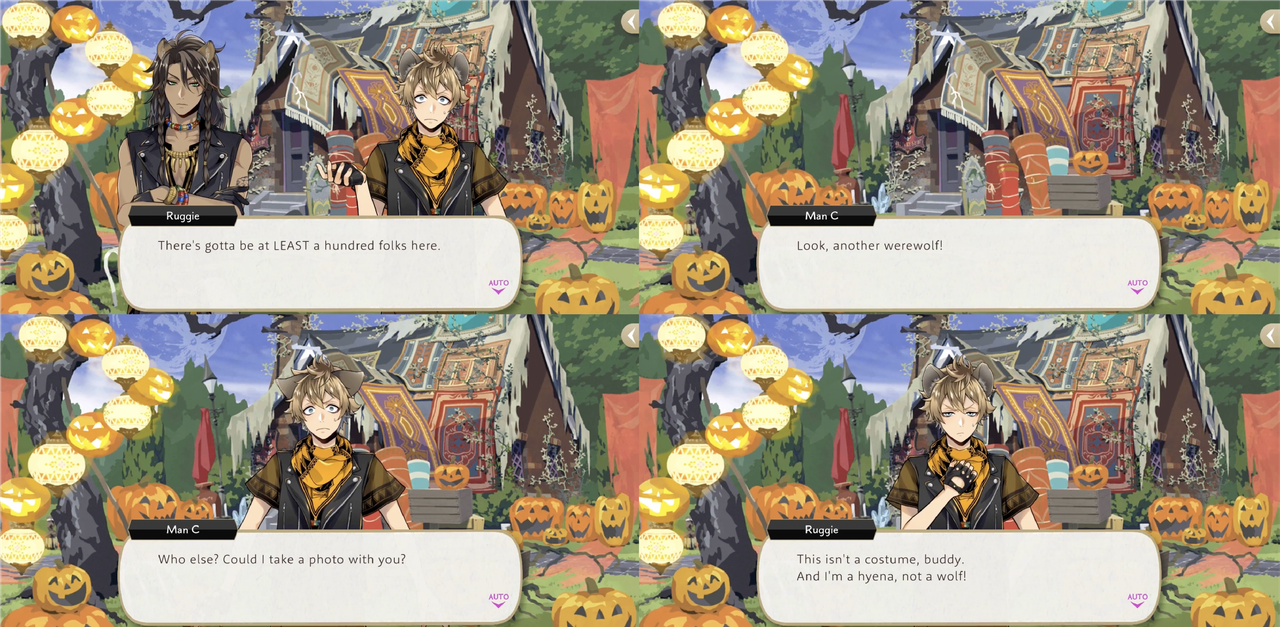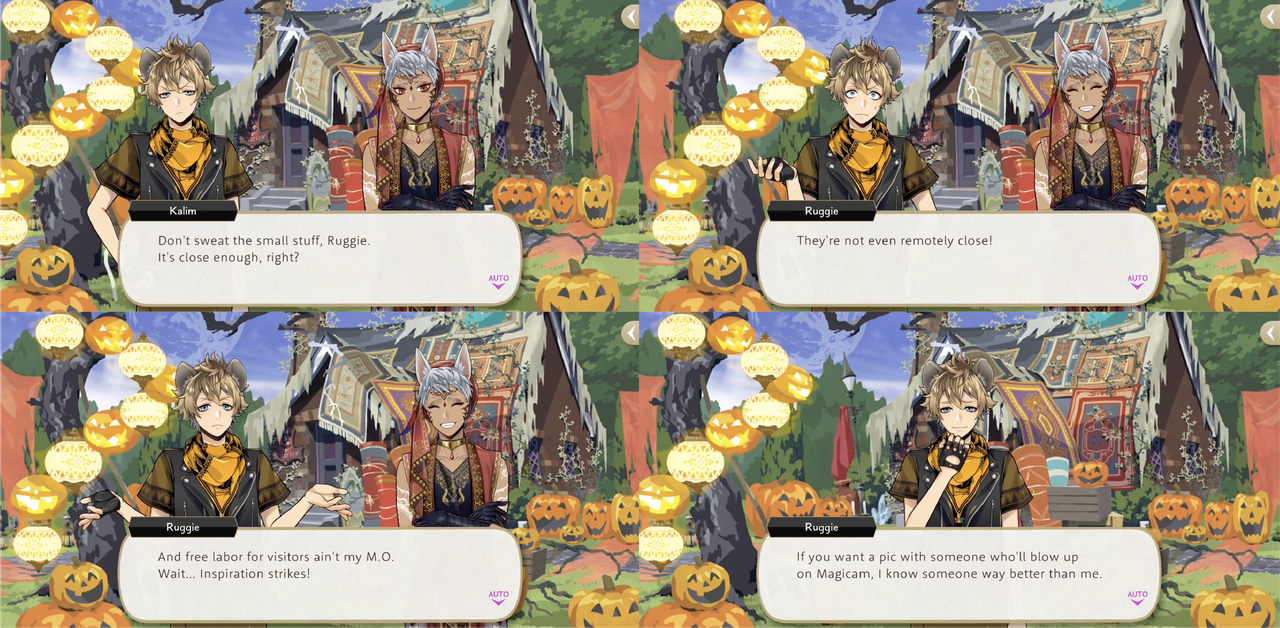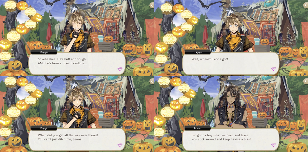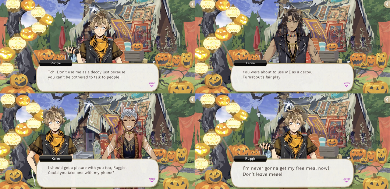 During Halloween Ruggie tries to escape a group of visitors by sending them after Leona instead, but Leona catches on to his ploy and leaves Ruggie to handle the visitors—and Kalim—by himself in preemptive self-defense.