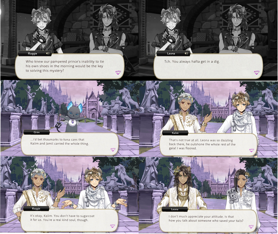 Despite the power imbalance between the two characters Ruggie does not hesitate to speak rudely of Leona, both to his face and behind his back. He says Leona’s actions during Fairy Gala make him “embarrassed to be part of Savanaclaw”, praises Kalim for his diligence and motivation setting him apart from Leona and laughs outright at how “cute” Leona looks in Malleus’ ceremonial robes.