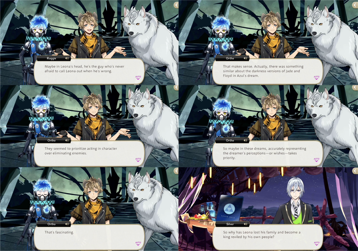 A dream version of Ruggie appears in Leona’s dream as a ringleader at a protest of citizens standing up against Leona’s rule. Ortho explains that is version of Ruggie crafted from Leona’s imagination. Jack wonders if a similar character from Leona’s imagination—Kifaji—is acting in Leona’s perception of him and Ortho observes, “maybe in these dreams, accurately representing the dreamer’s perceptions—or wishes—takes priority,” It is fascinating that Leona’s perception of and/or wishes for Ruggie and Kifaji are possibly that they will stand up against him.