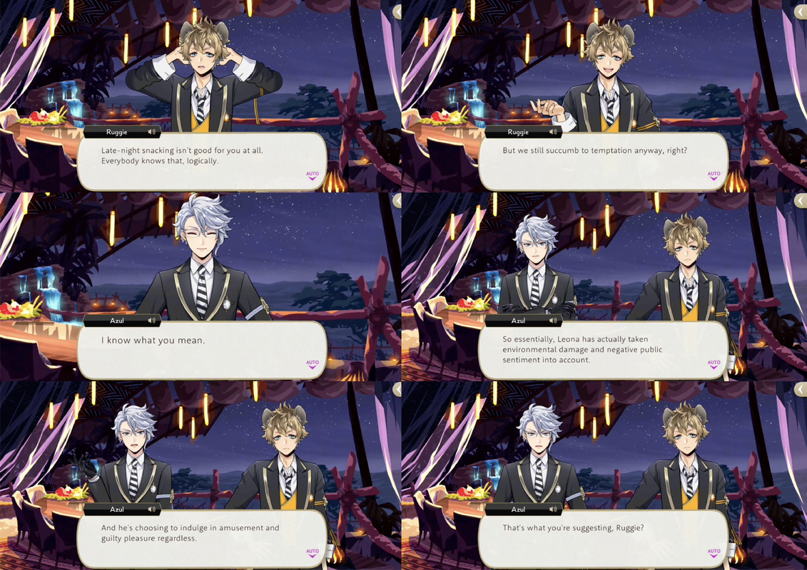 After an explanation from Idia on what it is that may be happening in Leona’s dream to make it so different from the rest it is Ruggie who guesses why it is that Leona chose failure, saying, “I bet he did it BECAUSE he knew better,” and comparing Leona’s dream to the guilty pleasure of a midnight snack.