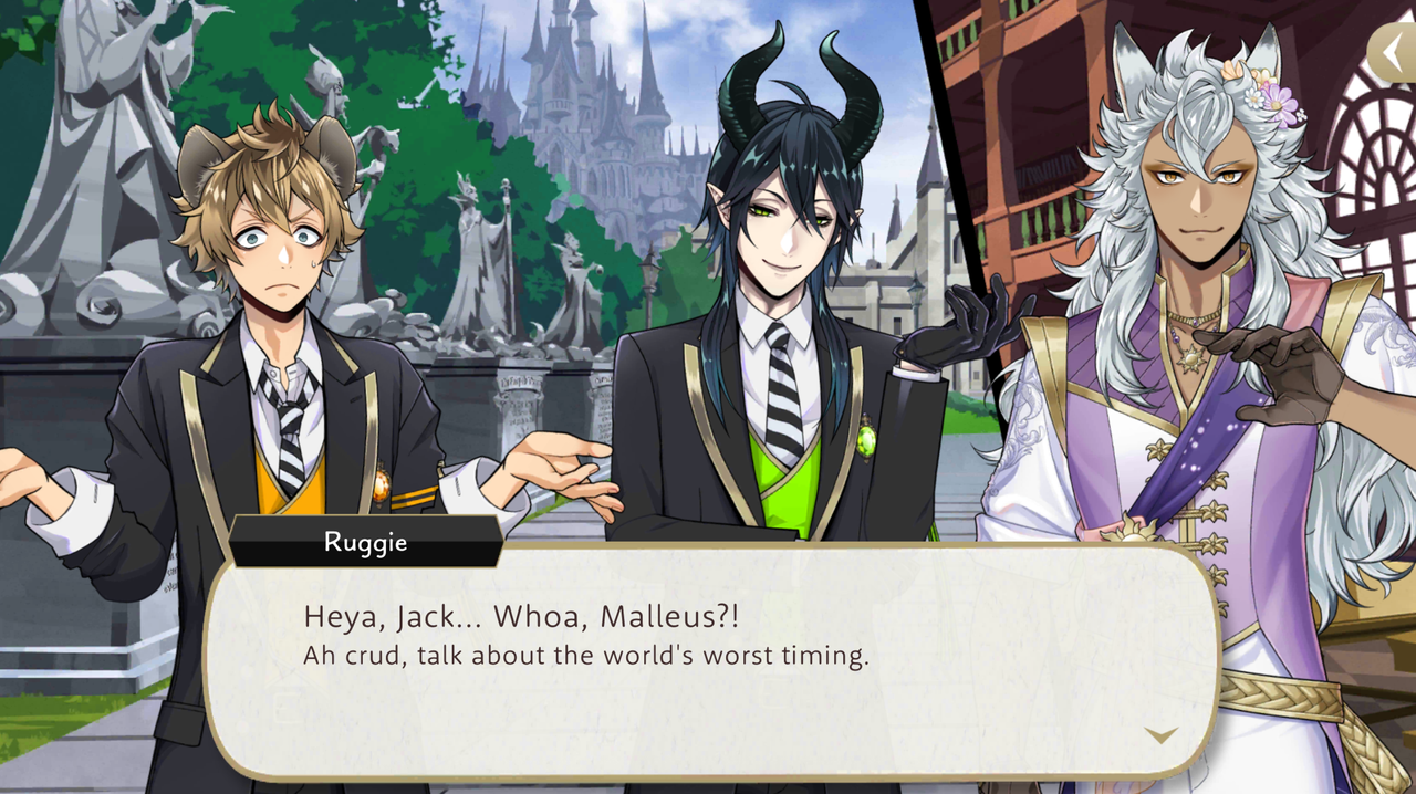 As of this writing Malleus and Ruggie have never actually interacted in the main story. Book 2 involves Ruggie taking a magic-boosting potion to magically control a crowd of campus visitors “like a stampede of wildebeests” to crush Malleus before a spelldrive game, but the plan is compromised, to Ruggie’s shock.