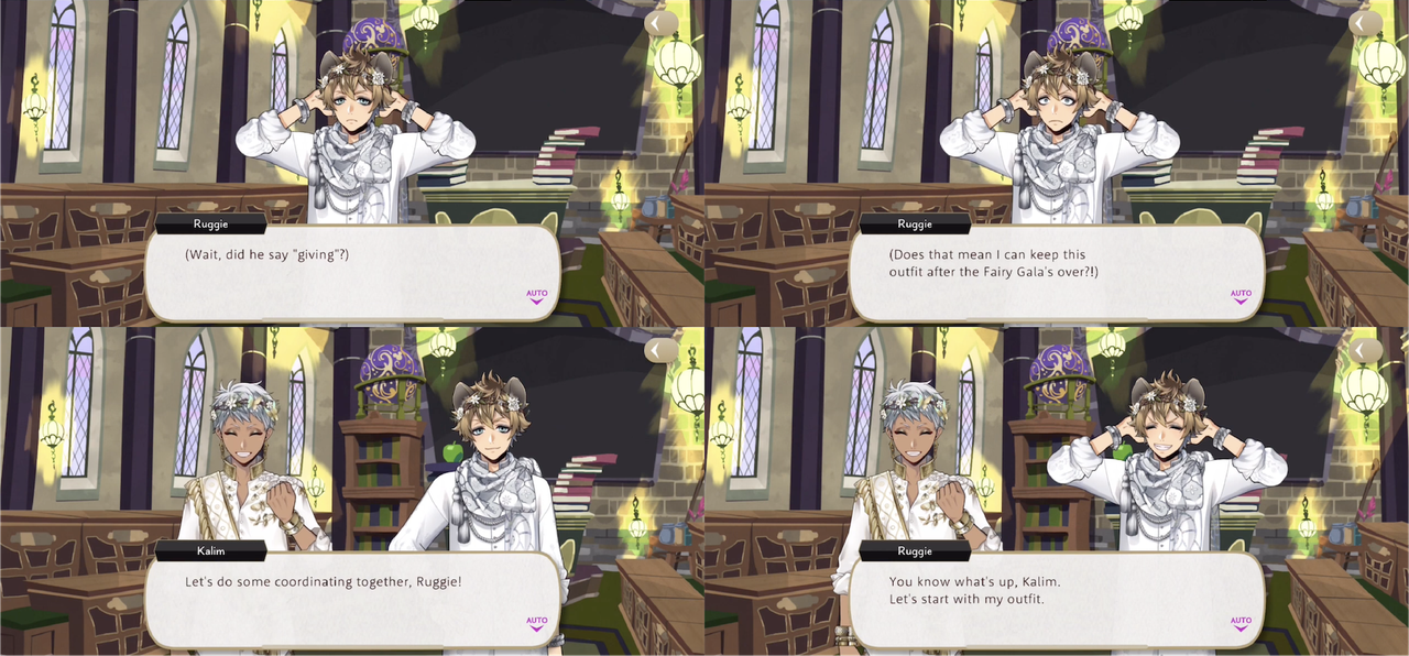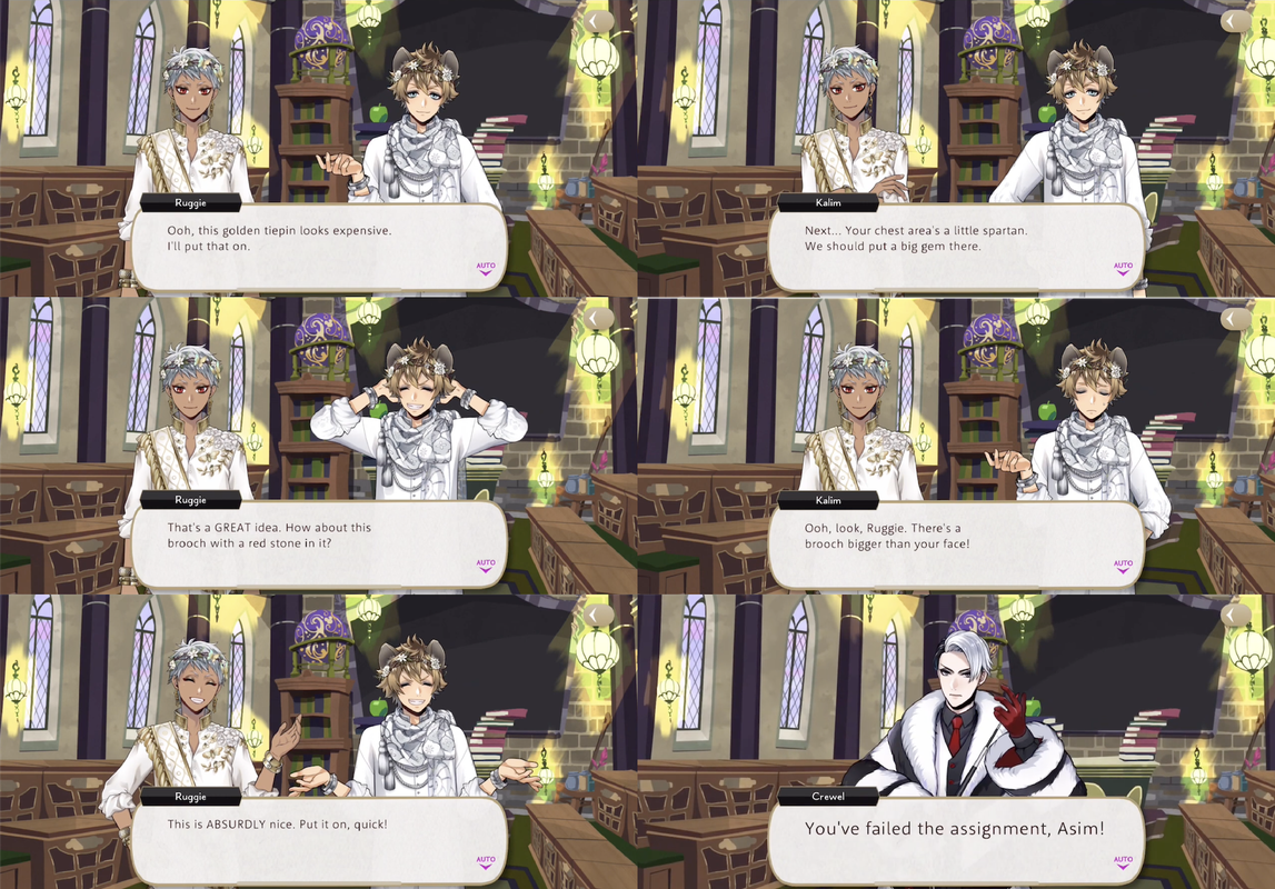 Misunderstanding Crewel’s instructions during Fairy Gala Ruggie encourages Kalim to dress him up in the most expensive looking accessories available, intending to “make a fortune” through reselling it all after the event. He then learns that he will not be allowed to keep any part of the outfit.