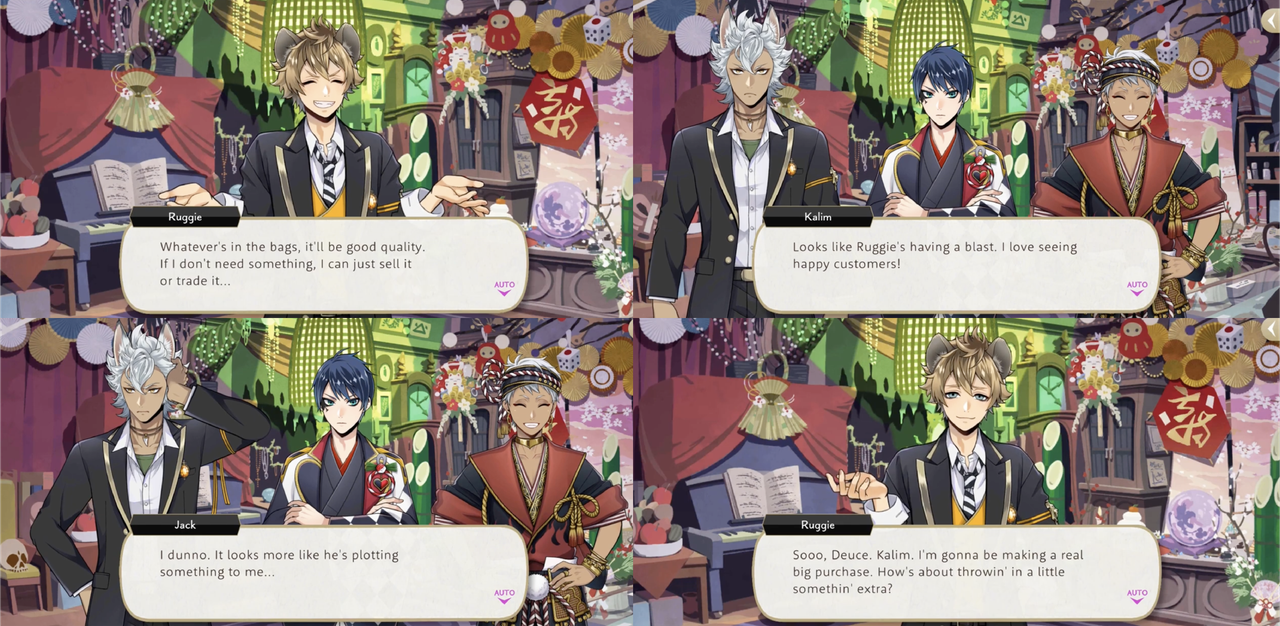 Ruggie shares his plan to sell or trade things that he receives in the new year’s mystery bags, and says that he will accept the grown-out hair of the lantern event group if they don’t need it, as he can sell it to a wig shop.