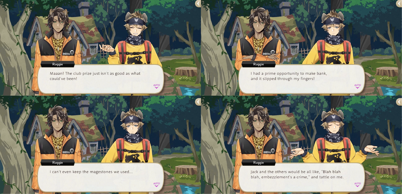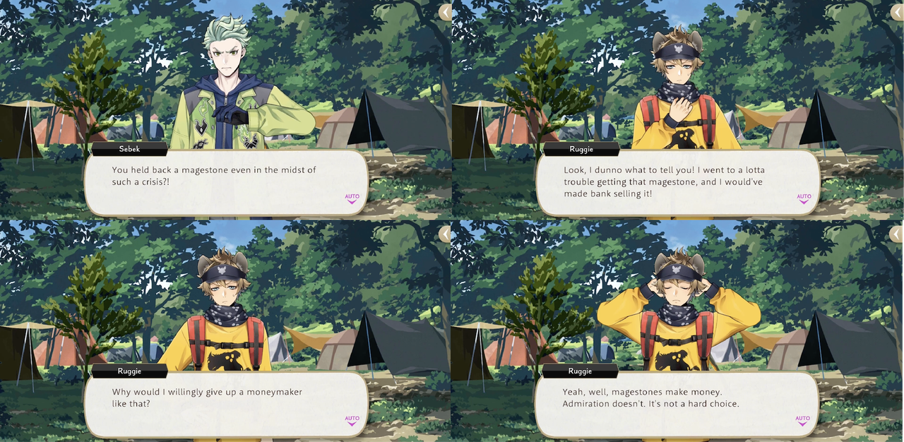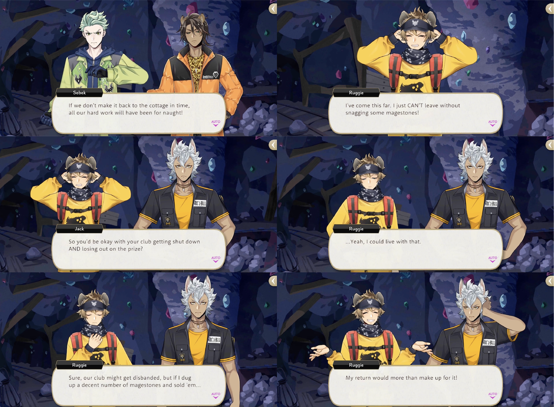 Ruggie refuses to leave the mines after the monster’s defeat. When Jack asks, “So you’d be okay with your club getting shut down AND losing out on the prize?” Ruggie responds, “…Yeah. I could live with that. Sure, our club might get disbanded, but if I dug up a decent number of magestones and sold ‘em…My return would more than make up for it!”