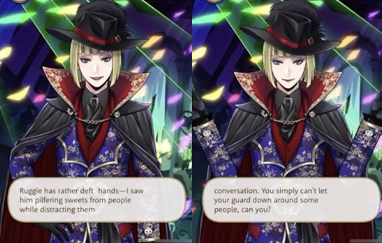 Ruggie also mentions “swiping” food before it was thrown away at a restaurant where he used to work, and at the end of Vargas Camp it is insinuated Ruggie had been intending to keep the necklace that Leona lost towards the beginning of the event, though he insists that he had just been holding onto it and had been intending to give it back all along.