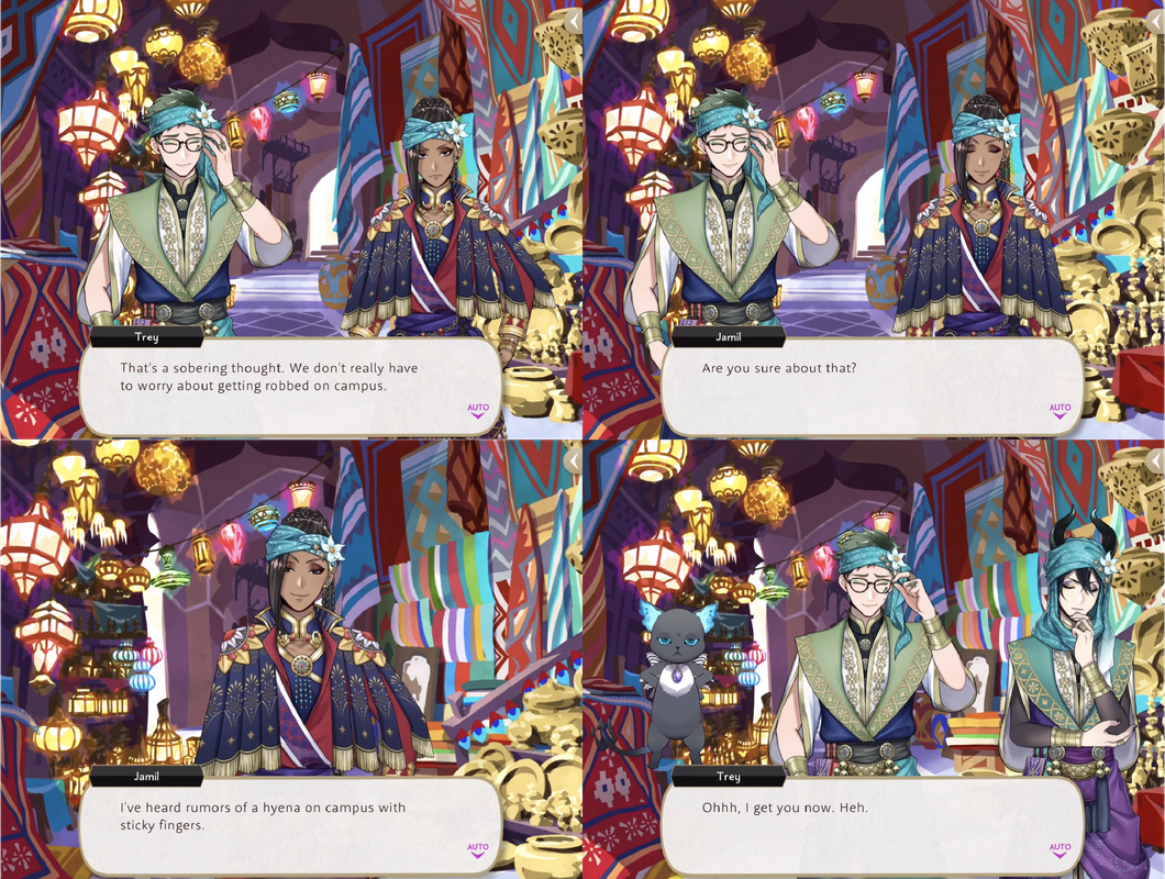 During Firelit Sky Trey expresses gratitude that they don’t have to worry about getting robbed at school and Jamil says that he has “heard rumors of a hyaena on campus with sticky fingers”.