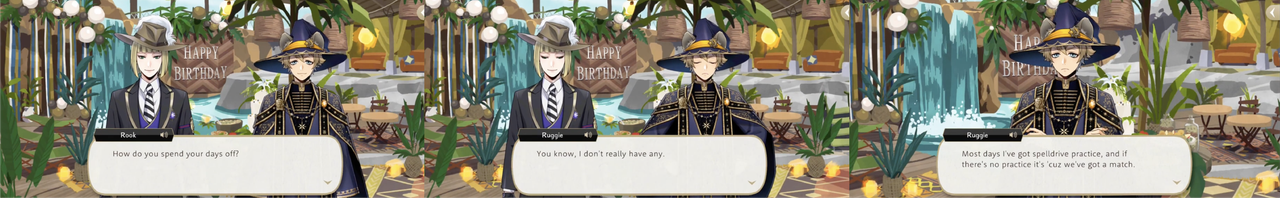 When Rook asks what Ruggie does on his days off, Ruggie replies that he doesn’t really have any: “Most days l’ve got spelldrive practice, and if there’s no practice it’s ‘cuz we’ve got a match.” (and other days he is almost always working: Ruggie’s Side Jobs)