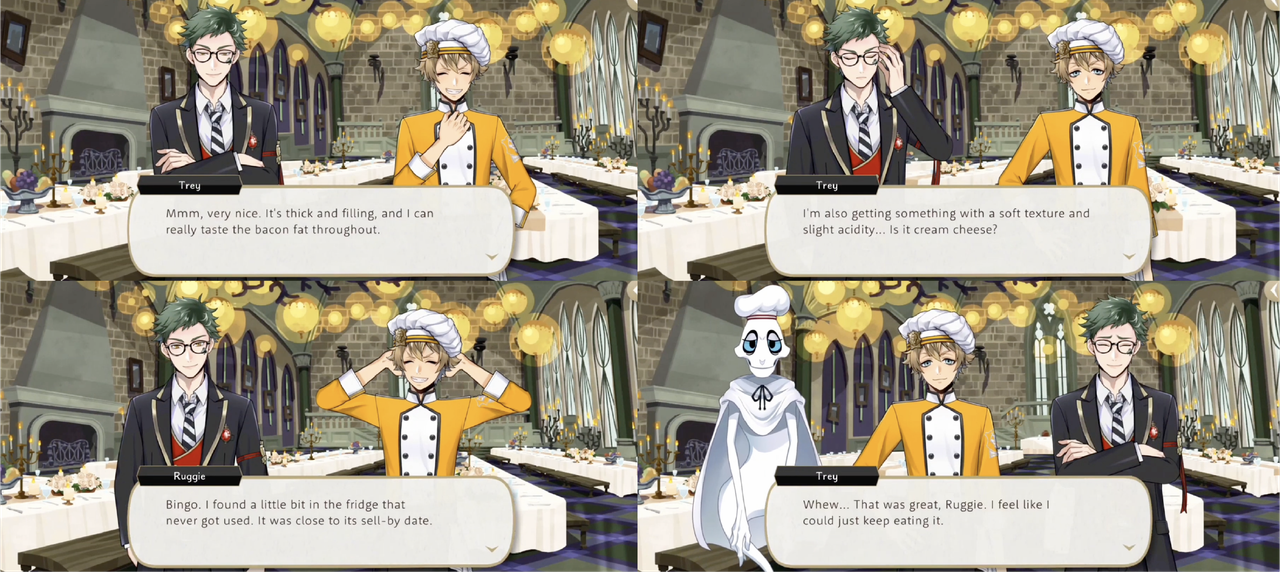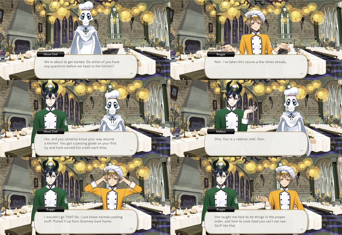 When Malleus comments that Ruggie must be a veteran chef Ruggie responds, “I just know normal cooking stuff. Picked it up from Grammy back home. She taught me how to do things in the proper order, and how to cook food you can’t eat raw. Stuff like that.”