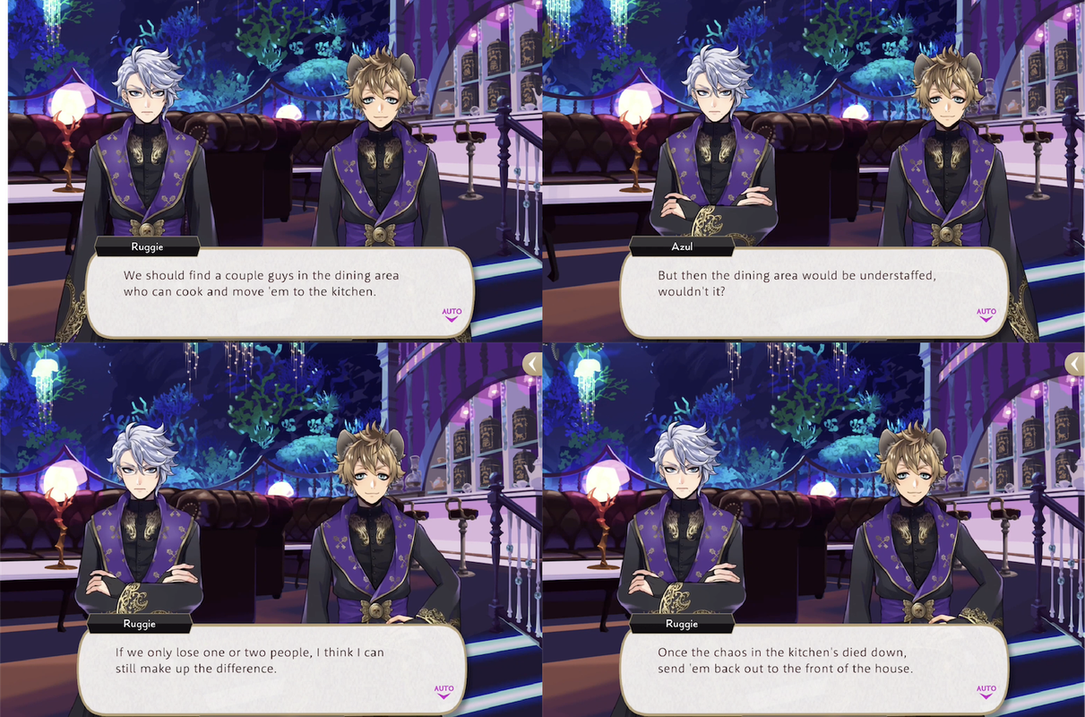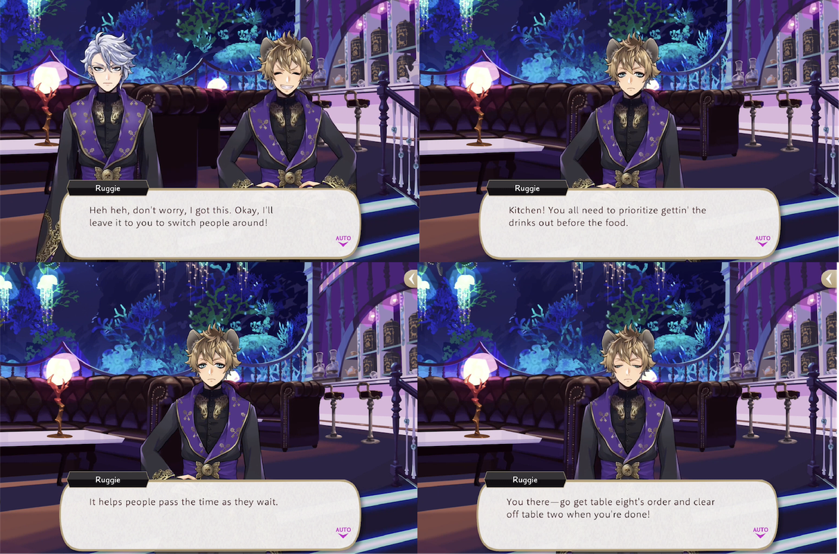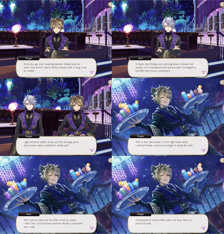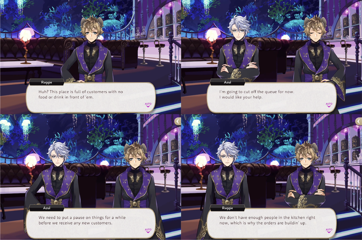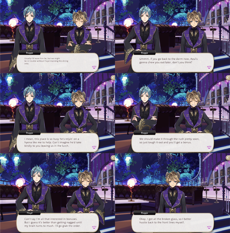 When Azul decides to temporarily close the lounge due to a large influx of customers Ruggie suggests sending staff working the floor into the kitchen, volunteering to cover for the loss of manpower himself.