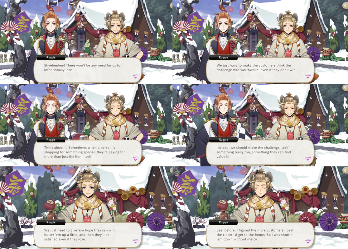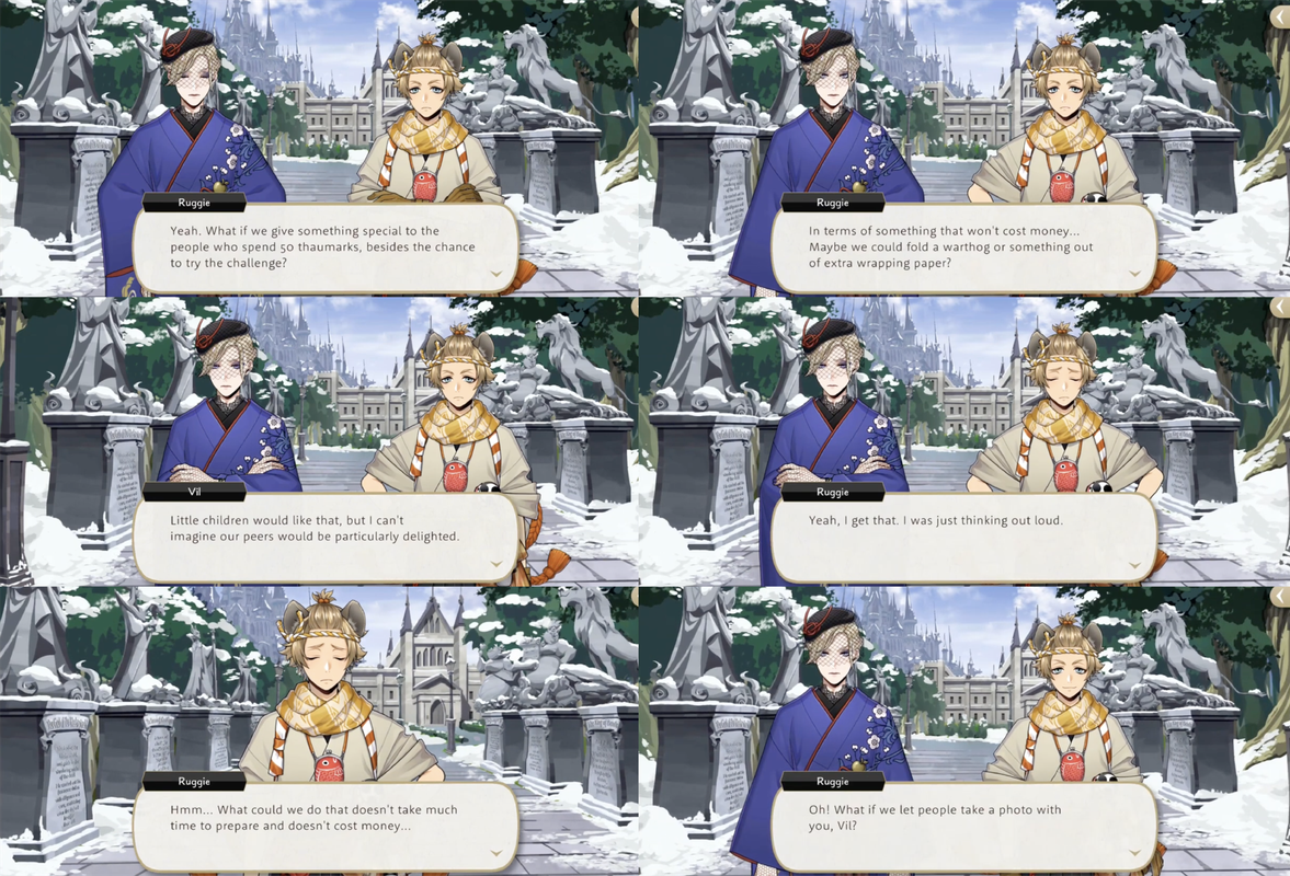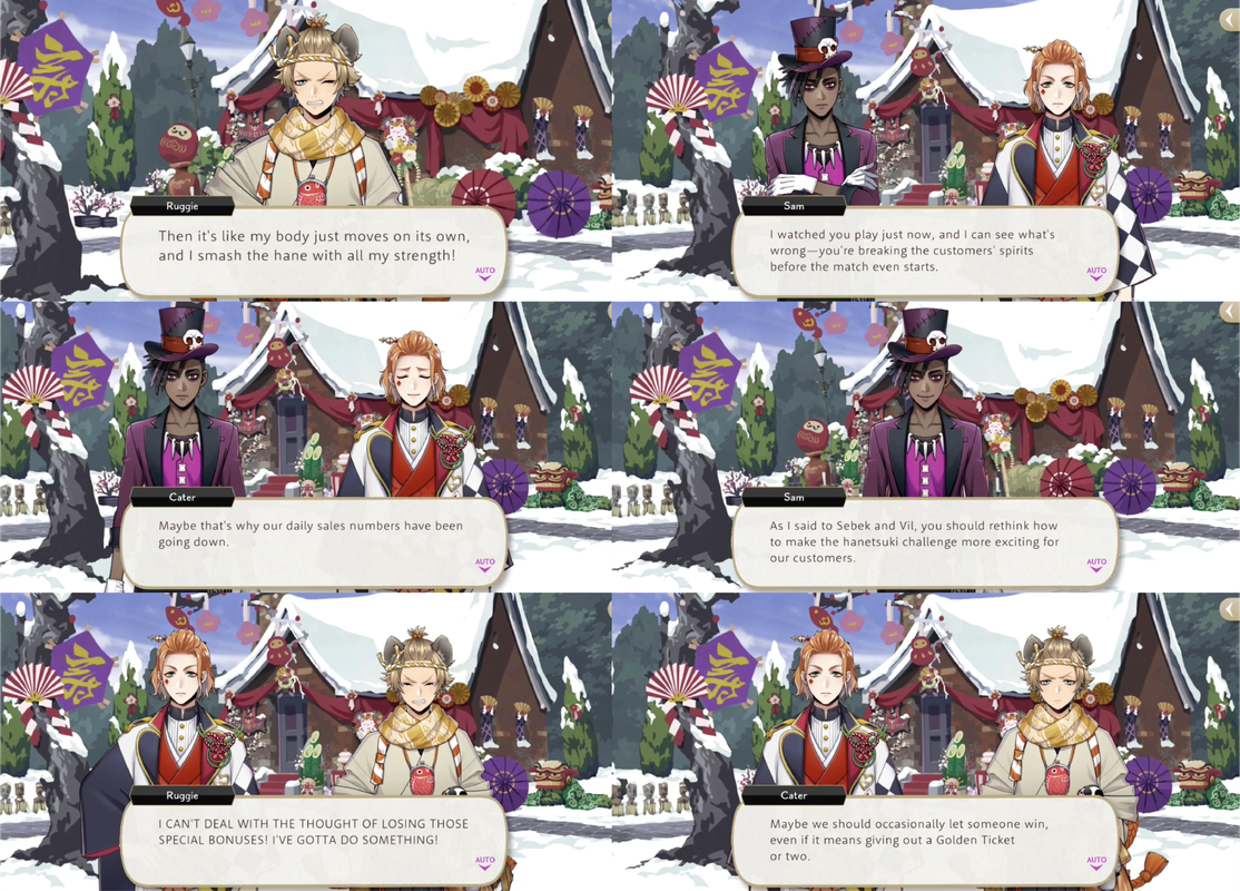 When Cater and Ruggie start losing customers due to always winning at the competition that customers earn through spending 50 thaumarks (5,000 madol) Cater suggests letting people win, but Ruggie comes up with a better idea: