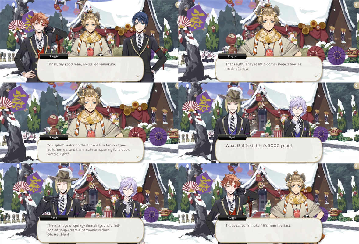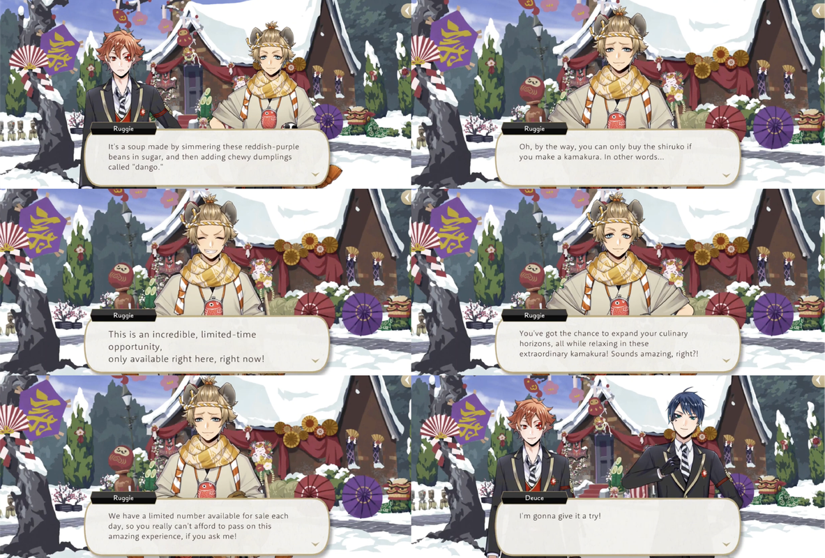 After Cater accidentally gets buried in snow Ruggie comes up with an idea: getting customers to build kamakura to clear the snow so that the staff no longer needs to, and then selling shiruko to those who do so.