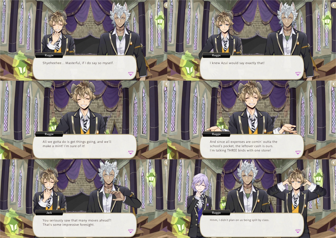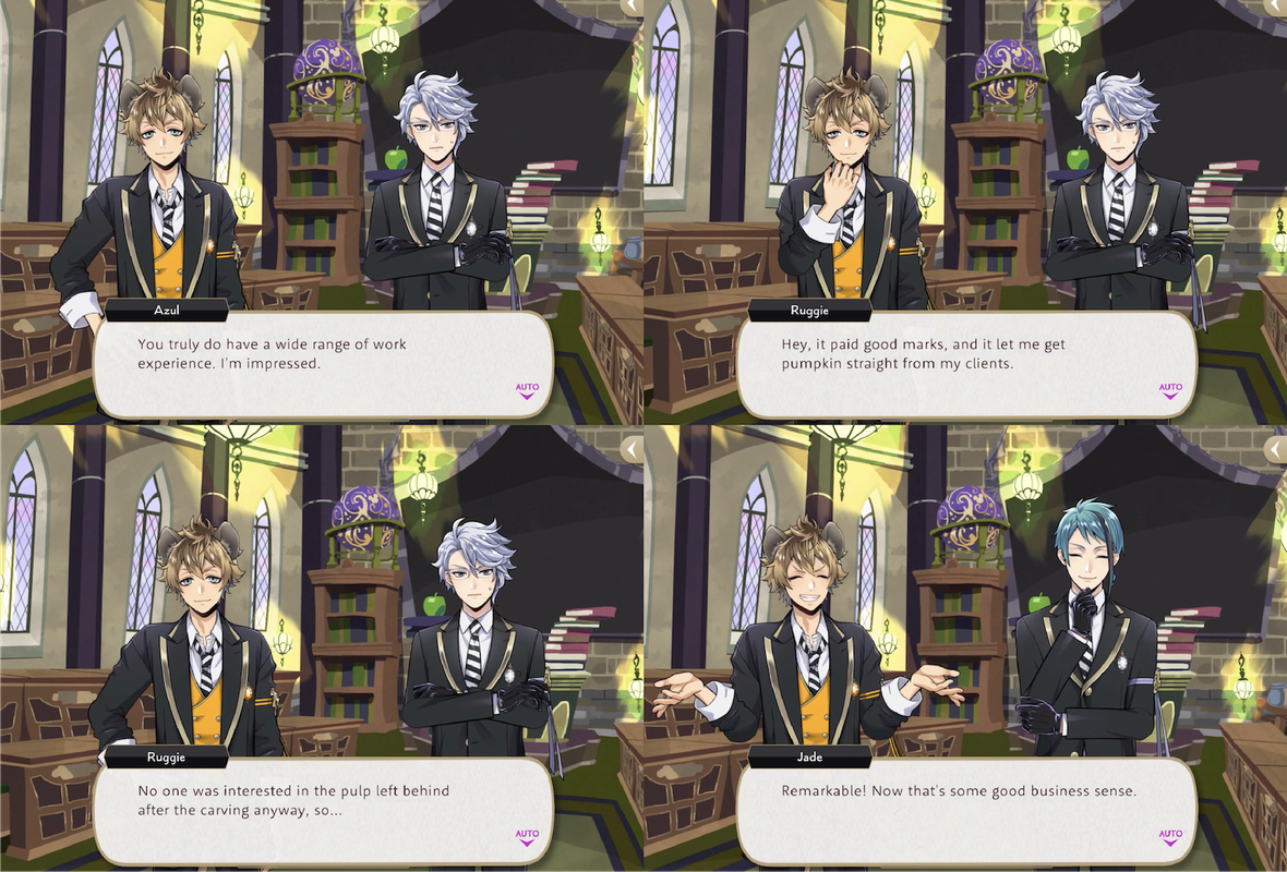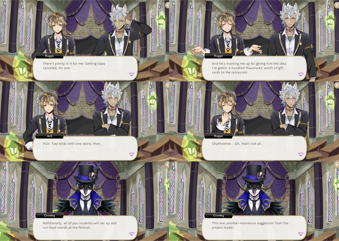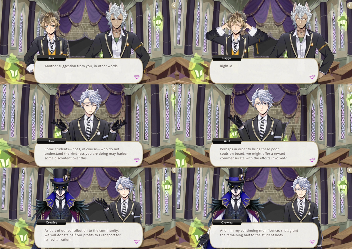 Jade, Cater and Jack all compliment Ruggie’s business sense, and Ruggie identifying a job opportunity is the catalyst for the entire Port Fest event: he reaches out to a local restaurant owner about the students of NRC running food stands at the festival, earning 100 thaumarks (10,000 madol) worth of gift cards to the restaurant for the idea.