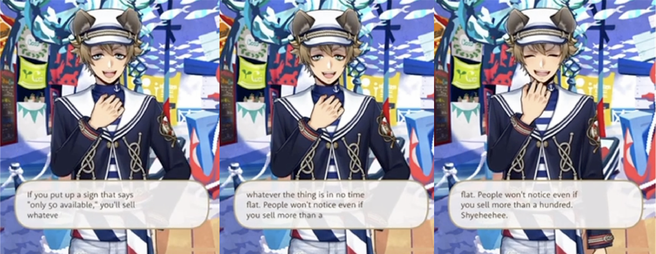 The following year he is employed at the store himself and proves to be an effective salesman, convincing Epel to purchase expensive sunglasses, a Diasomnia student who wanted one tumbler to buy two, and a Pomefiore student to get both a lamp and a plant for his room.