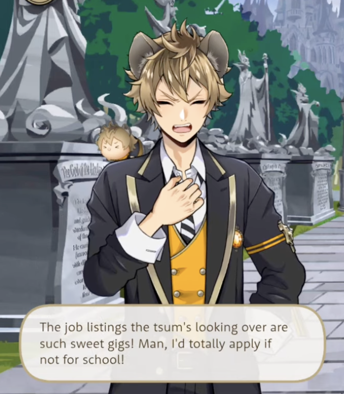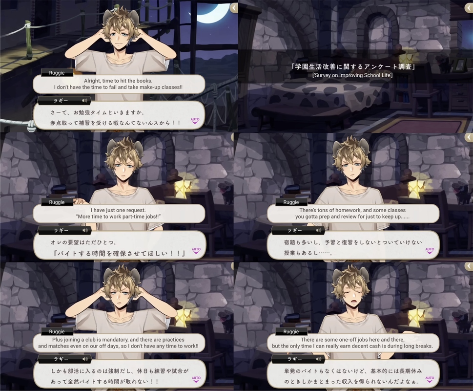 On a survey for improving life at school Ruggie writes that he wants students to have more time to work part-time jobs, as he can only make proper money during long breaks due to clubs being mandatory, plus homework and classes.