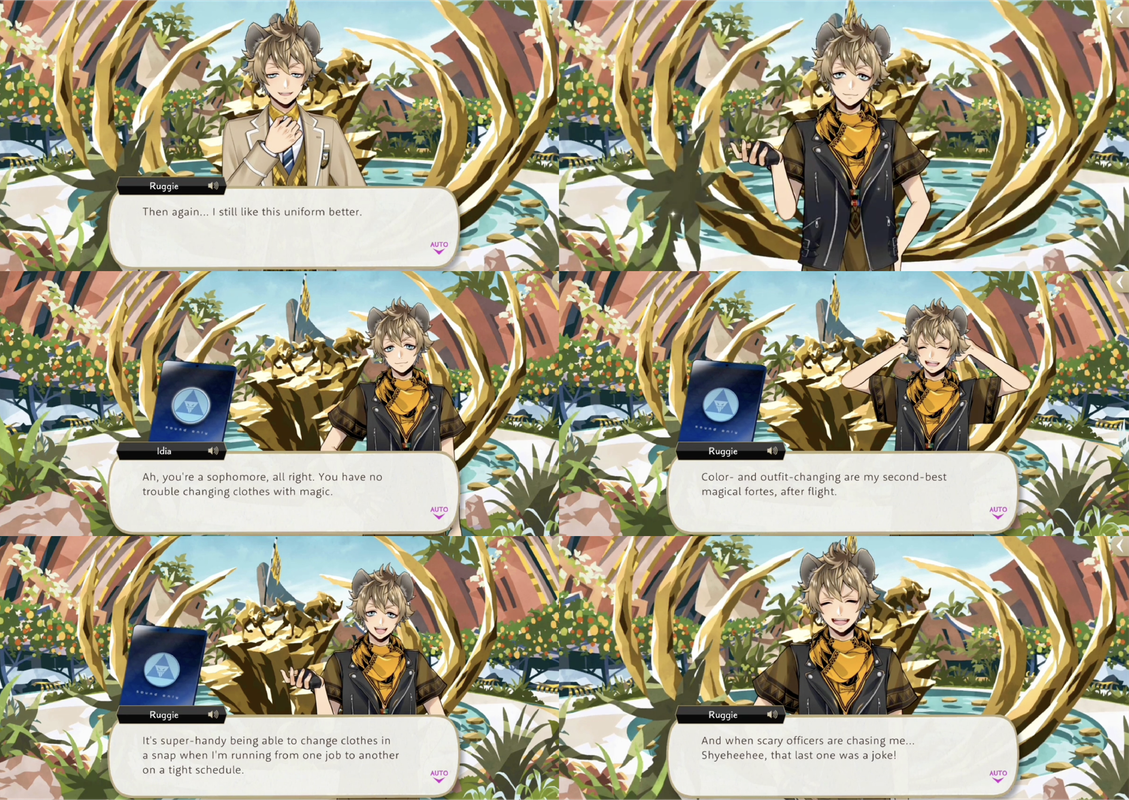Ruggie says that color- and outfit-changing magic are his second-best magical fortes after flight, and they come in handy for changing clothes quickly when running from one job to another.