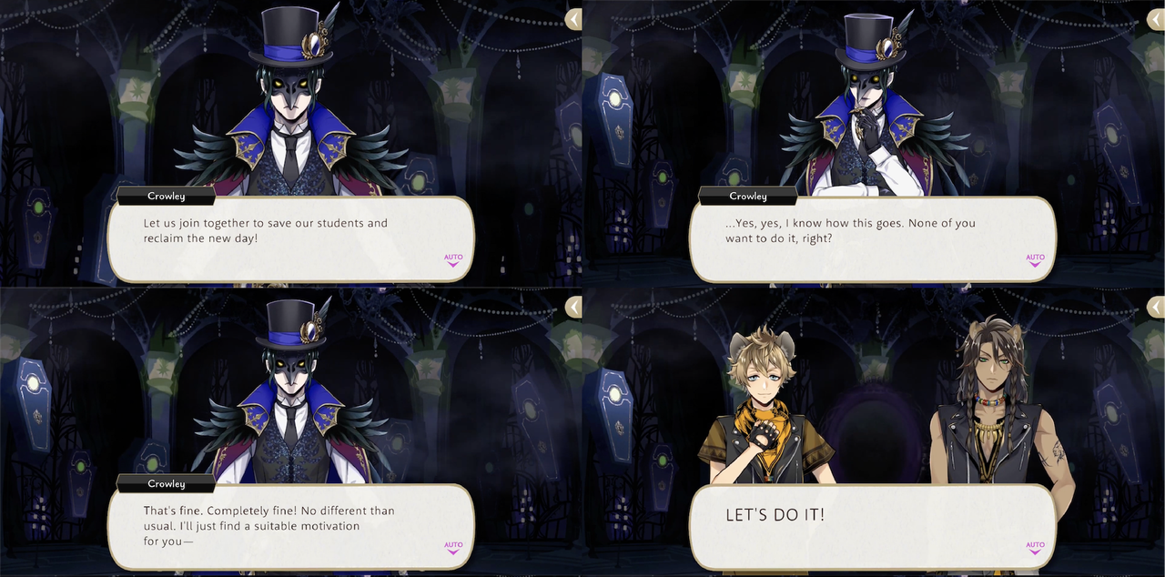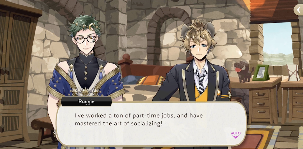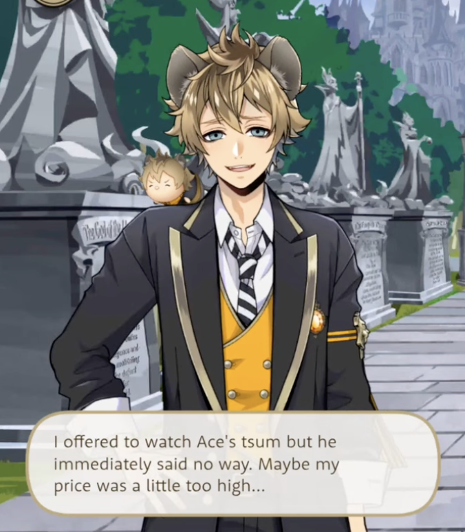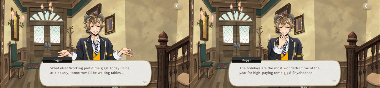 Ruggie says that he has worked “a ton of part-time jobs” and has “mastered the art of socializing,” and his motivation for wanting to help the kidnapped students of the Spectral Soiree event is because a never-ending Halloween means no winter holiday, which would mean not being able to take advantage of “the major hustle opportunities” of the holiday season.