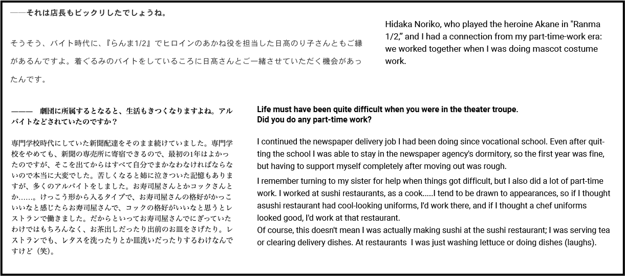 Yamaguchi said that he supported himself through part-time jobs while a member of the theater troupe, receiving help from his sister but also working as a mascot-character (where he first met Hidaka Noriko, with whom he would eventually collaborate on Ranma 1/2), delivering newspapers, and working at restaurants, often deciding where to work based on what uniforms he liked. ( Interview Source 1 | Interview Source 2 )
