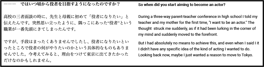 In an interview Yamaguchi explains that he first decided to become an actor in high school when he suddenly announced the idea during a parent-teacher conference but, in retrospect, he knew nothing about acting at the time and possibly just wanted a reason to move to Tokyo. ( Interview Source )