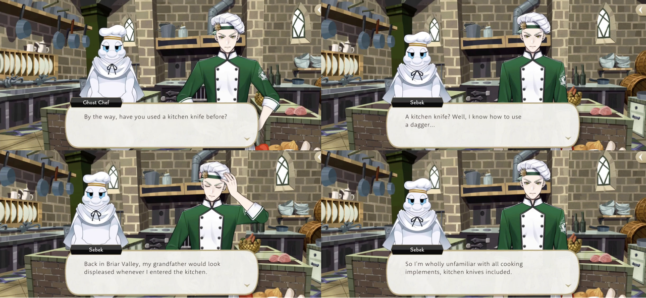 Sebek says that, while he knows how to use a dagger, he never learned how to use a kitchen knife because Baul would look displeased whenever he entered a kitchen as a child.