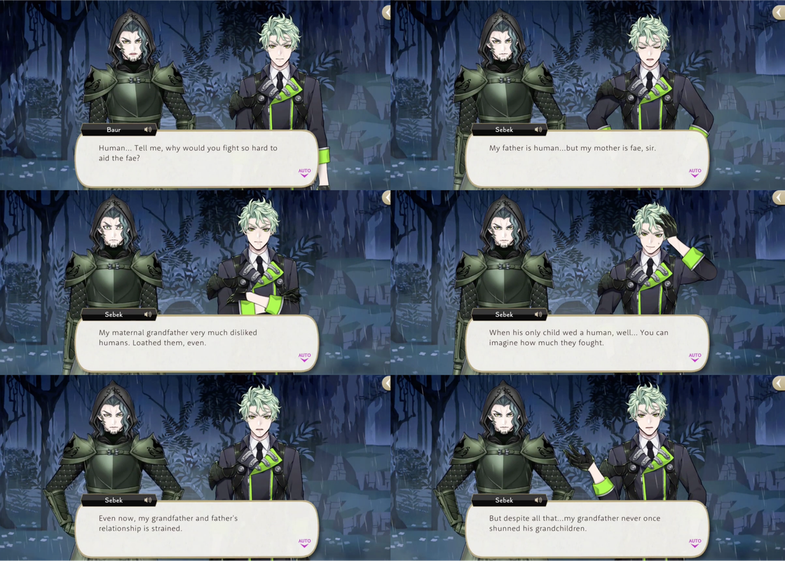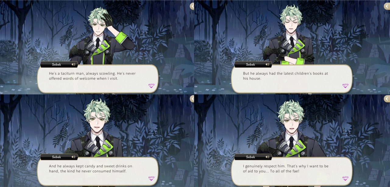 Sebek explains to Baul himself, “My maternal grandfather very much disliked humans. Loathed them, even. When his only child wed a human, well… You can imagine how much they fought. Even now, my grandfather and father’s relationship is strained. But despite all that…my grandfather never once shunned his grandchildren. He’s a taciturn man, always scowling. He’s never offered words of welcome when I visit. But he always had the latest children’s books at his house. And he always kept candy and sweet drinks on hand, the kind he never consumed himself. I genuinely respect him.”