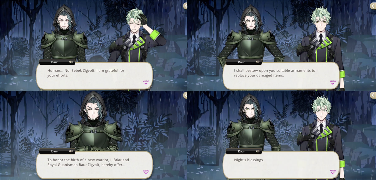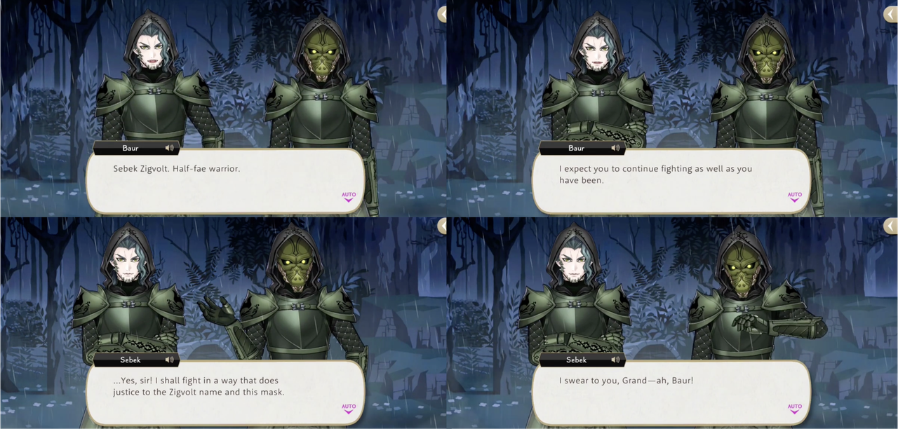 Baul compliments Sebek’s fighting and refers to him by his name (instead of “human”) for the first time, and blesses him “to honor the birth of a new warrior.” Sebek is then magically knighted with Briarland royal guardsman armor and the magearm of a fallen ally, as well as a crocodile mask.