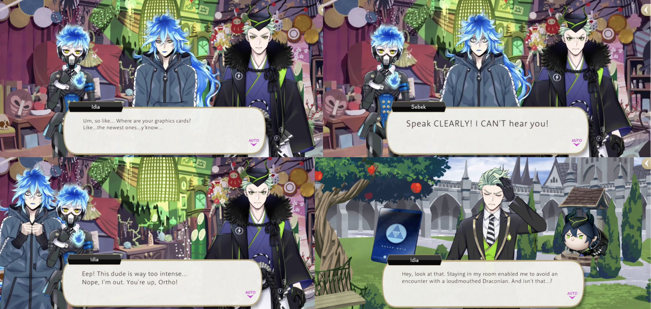 Idia and Sebek do not get along well, with Idia giving up on attempting to converse with him during New Year’s for Sebek being “way too intense.” Idia in tablet-mode happens across Sebek during Tsumsted and observes, “Staying in my room enabled me to avoid an encounter with a loudmouthed Draconian.”