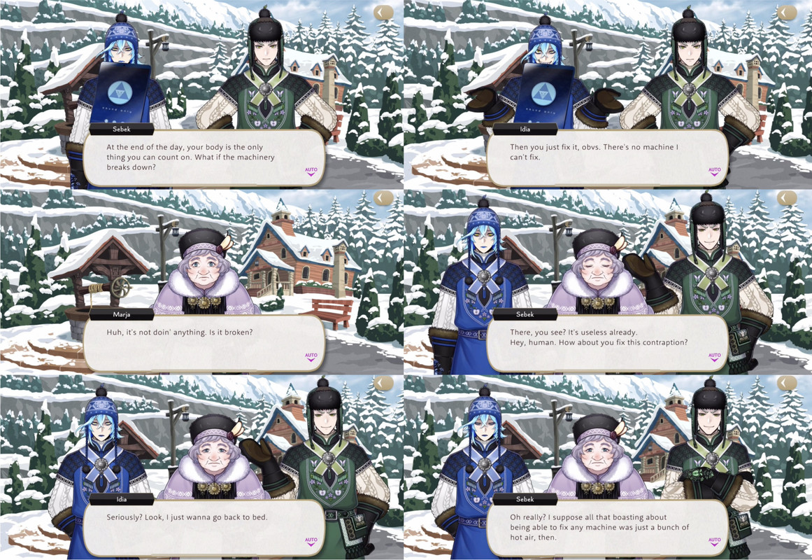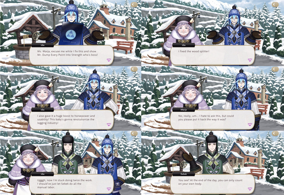 When Marja’s woodsplitting machine breaks Sebek goads Idia into fixing it, but he adds so many improvements that Marja can no longer use it. Sebek declares, “You see? At the end of the day, you can only count on your own body.”