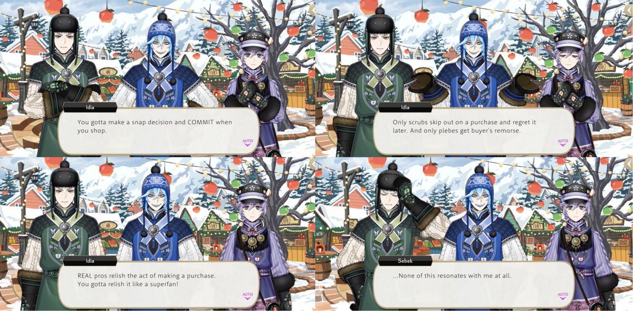 Sebek comments on Idia’s shopping habits not resonating with him at all, and when Idia suggests the team name of “Beauties Sleeping” Sebek vetoes it immediately for not suiting his image.