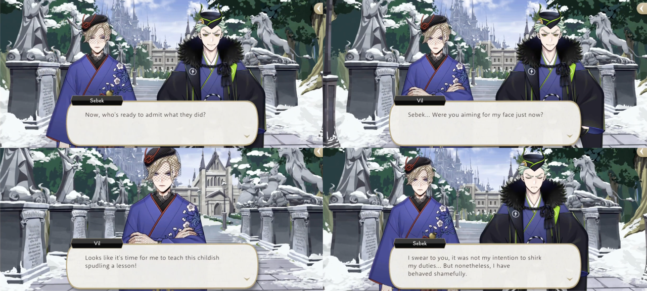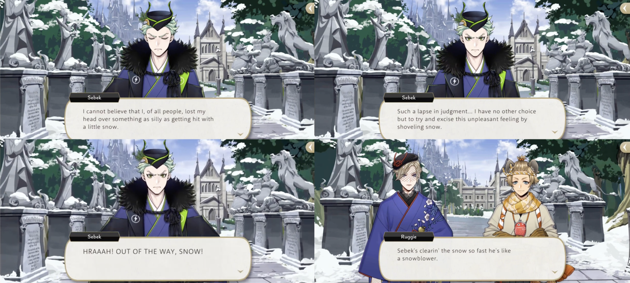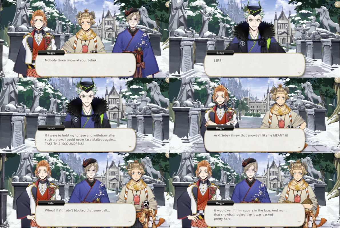 During the drama of New Years Sebek accuses the group of Ruggie, Vil and Cater of throwing a snowball at him, saying, “If I were to hold my tongue and withdraw after such a blow, I could never face Malleus again” and attacking them with snow.