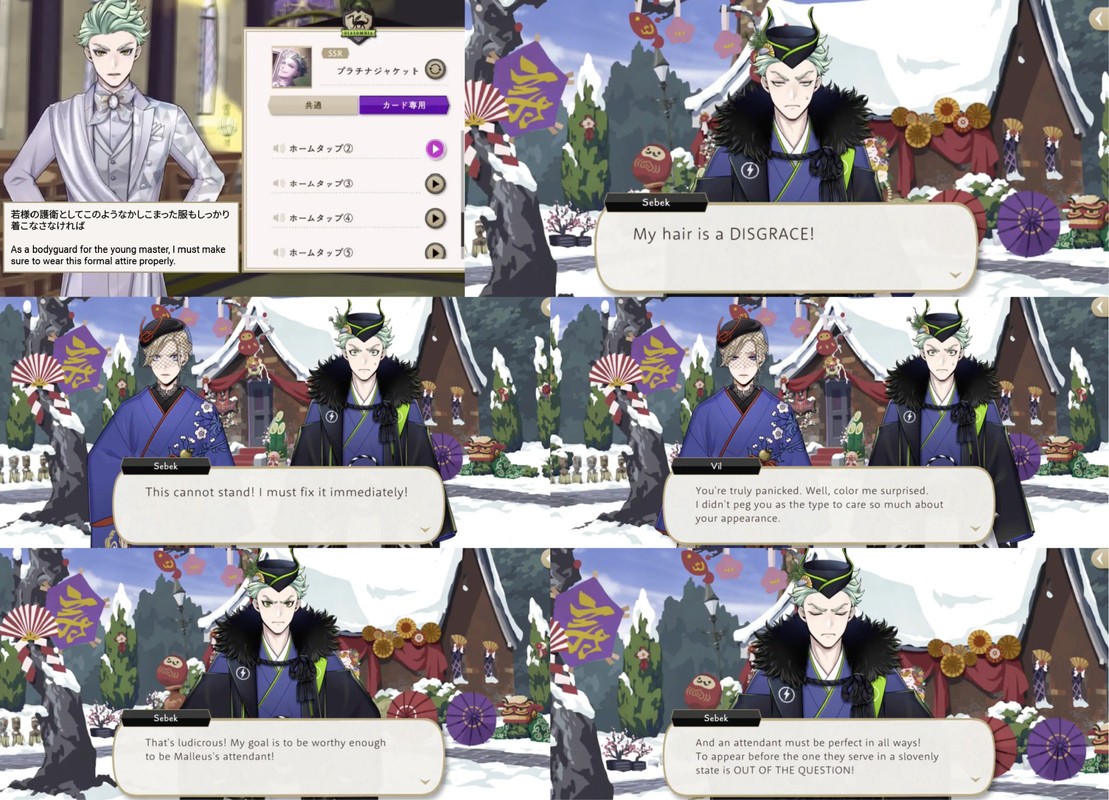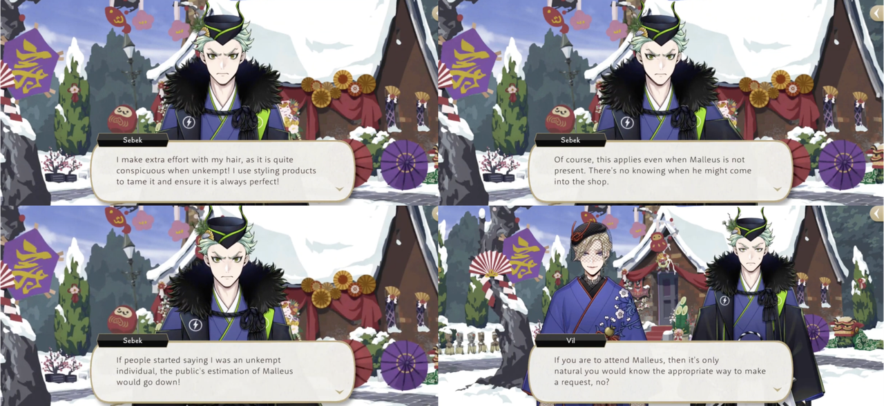 This is an issue during New Year when he musses up his hair during his shift at the school store. Vil comments that he didn’t think Sebek was the type to worry about his appearance and Sebek responds, “My goal is to be worthy enough to be Malleus’s attendant! And an attendant must be perfect in all ways! To appear before the one they serve in a slovenly state is OUT OF THE QUESTION!”