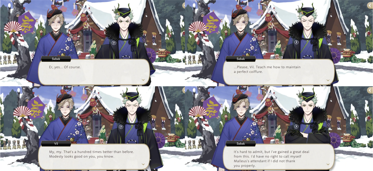 Vil uses Sebek’s devotion to convince him to be more polite, saying, “If you are to attend Malleus, then it’s only natural you would know the appropriate way to make a request, no?,” and Sebek asks Vil for guidance rather than demanding it.