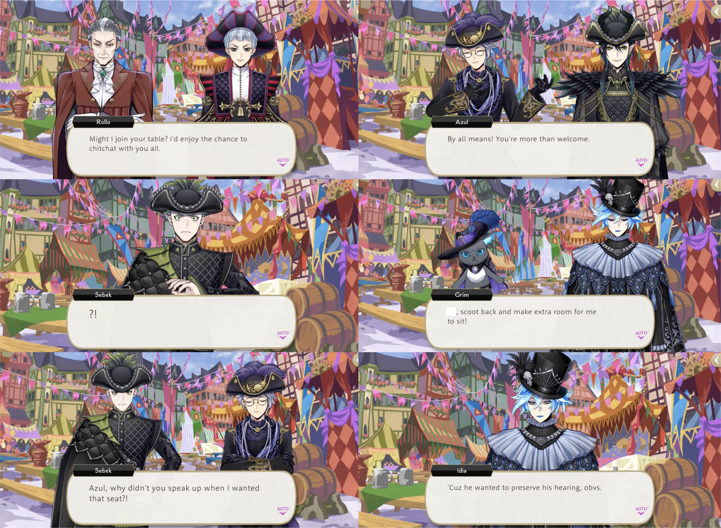 Later, Malleus chooses to sit next to Grim at a table. Sebek insists on a game of rock-paper-scissors to battle for the seat, and loses. When Rollo expresses interest in sitting next to Malleus, Azul recommends that Grim sit on the prefect’s lap.