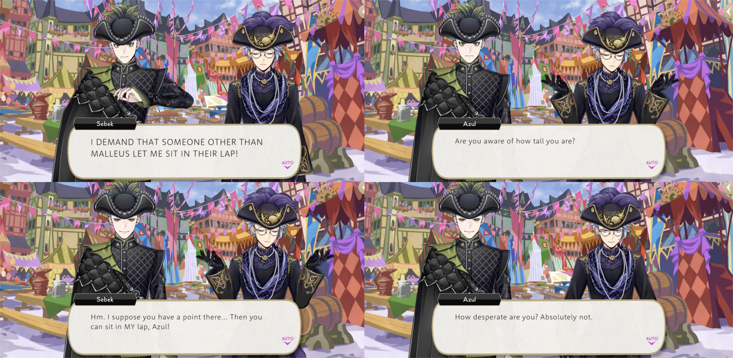 Sebek insists someone allow him to sit on their lap, too, so that he may sit at the same table as Malleus. When Azul points out the Sebek is extremely large, Sebek asks Azul to sit on his lap, instead. Azul says no and Malleus sends Sebek away.