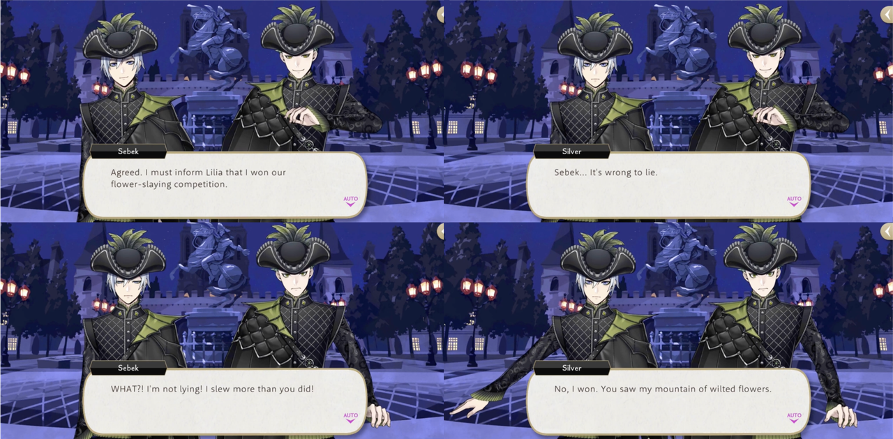 After their flower-slaying competition Sebek says he will be informing Lilia that he was triumphant, and Silver tells him that it is wrong to lie. They proceed to argue over who truly eradicated the most fire lotuses.