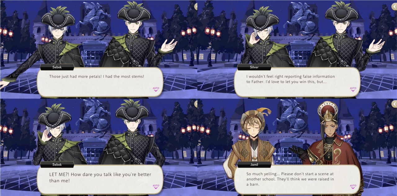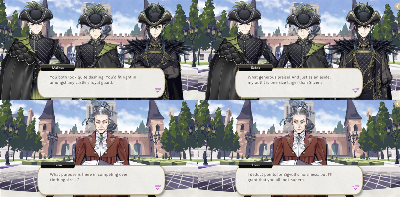 After Malleus compliments Sebek and Silver both on their Glorious Masquerade outfits Sebek declares, “My outfit is one size larger than Silver’s!” (Trein: “What purpose is there in competing over clothing size..?”)