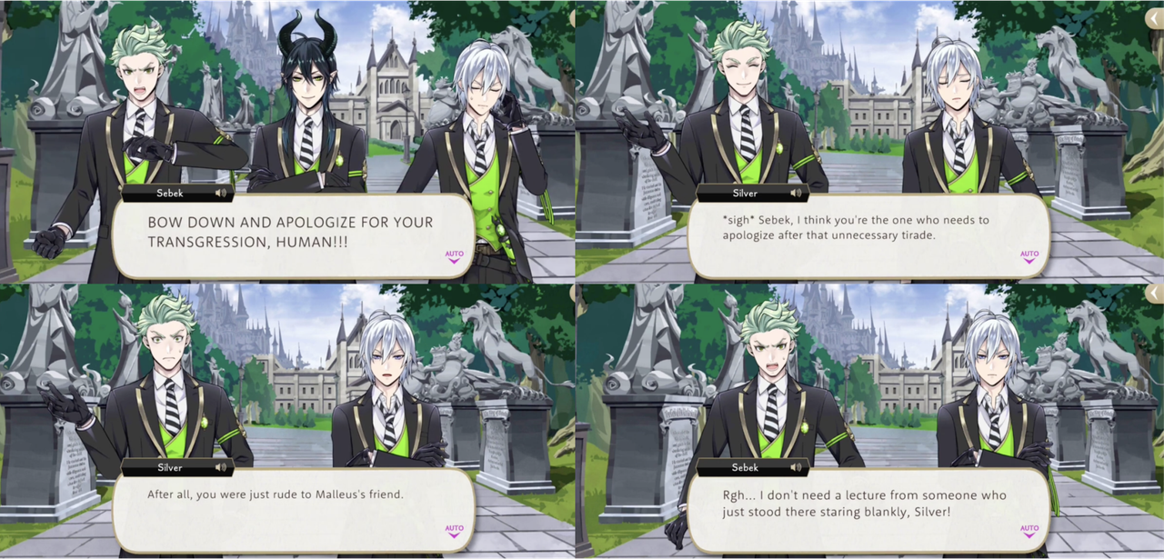 After Sebek admonishes the prefect for referring to Malleus as “Hornton” Silver says he owes them an apology. Sebek responds, “I don’t need a lecture from someone who just stood there staring blankly, Silver!”