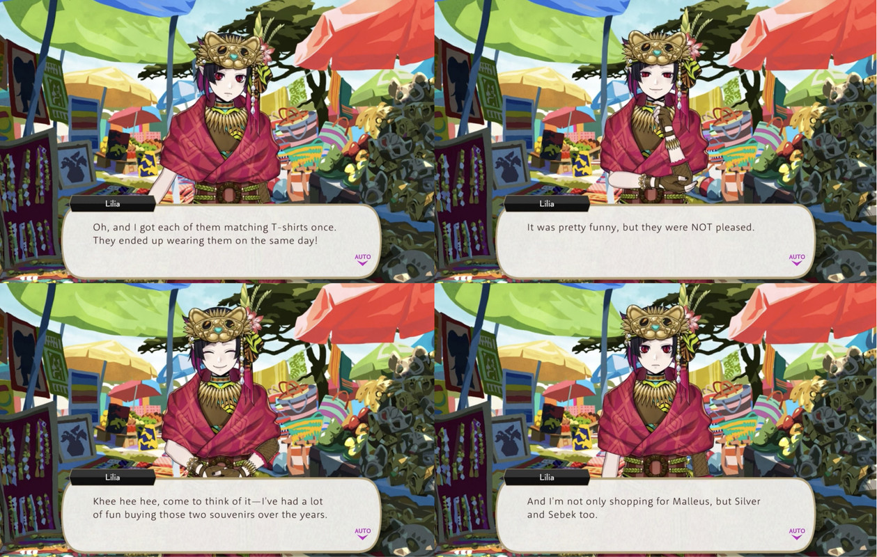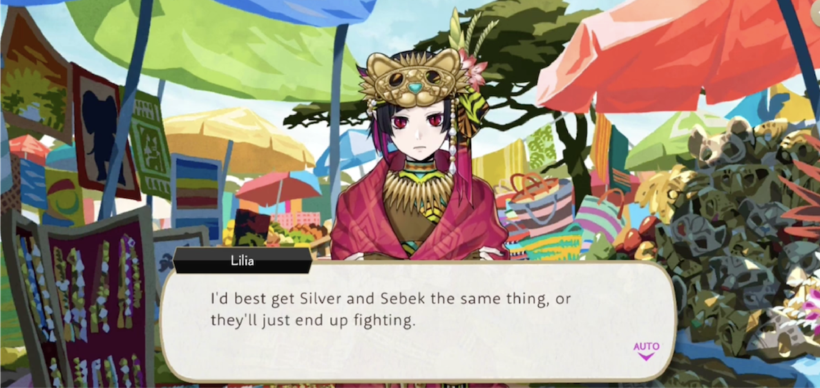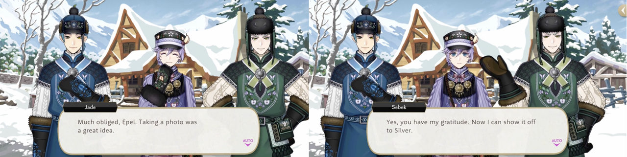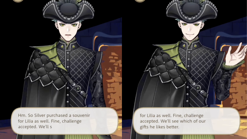 Sebek purchases a souvenir for Lilia in Fleur City and, upon learning that Silver has purchased one as well, says, “We’ll see which of our gifts (Lilia) likes better.”