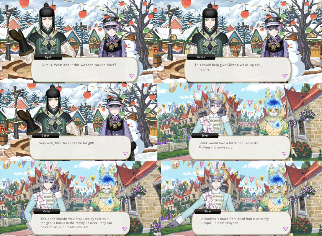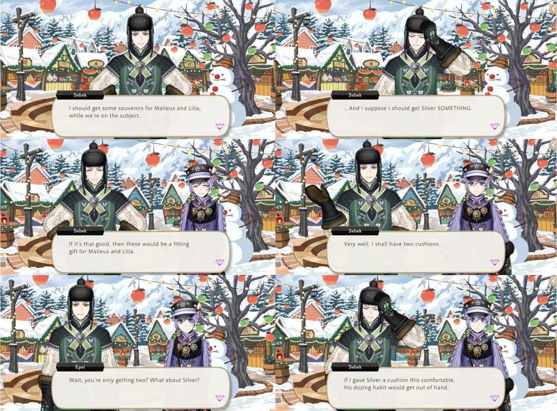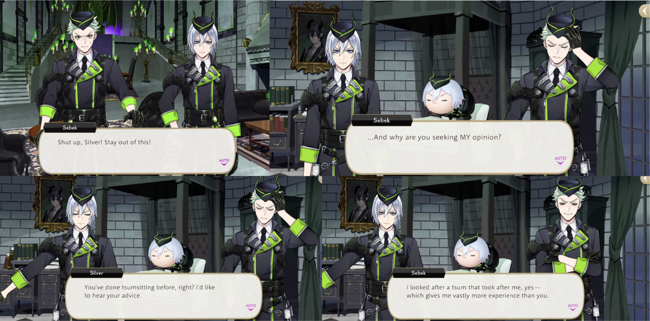 Both Sebek and Silver have participated in hometown events for other characters, and both bought souvenirs for one another: Sebek buys cushions for Malleus and Lilia but decides not to get one for Silver, as “his dozing habit would get out of hand.” Instead Sebek purchases him a cuckoo clock, as it “could give Silver a wake-up call.”