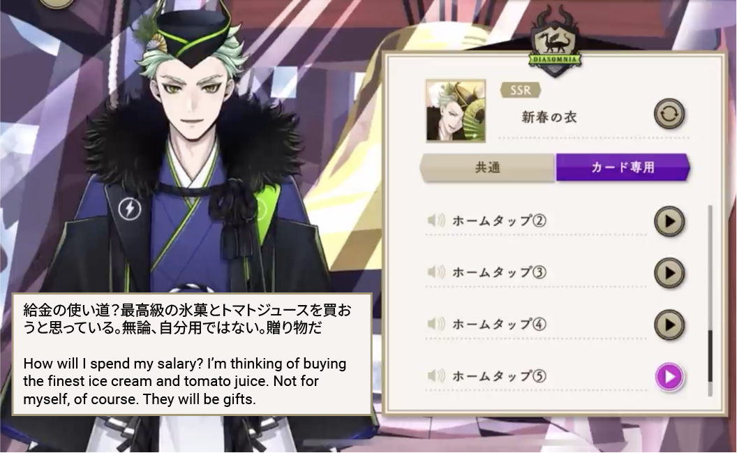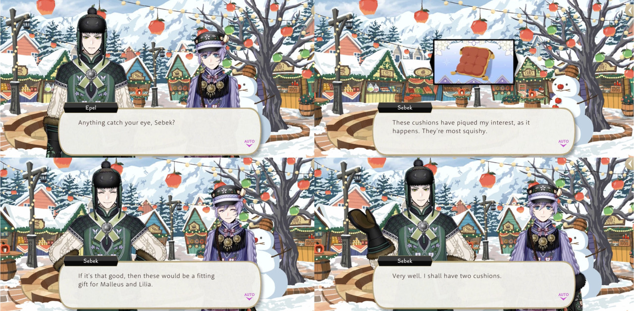 He purchases cushions for them both as souvenirs, and has a voice line about using his salary from working at the school store to buy high-quality ice cream and tomato juice. While he does not specify whom he will be gifting them to, those are Malleus and Lilia’s favorite foods.