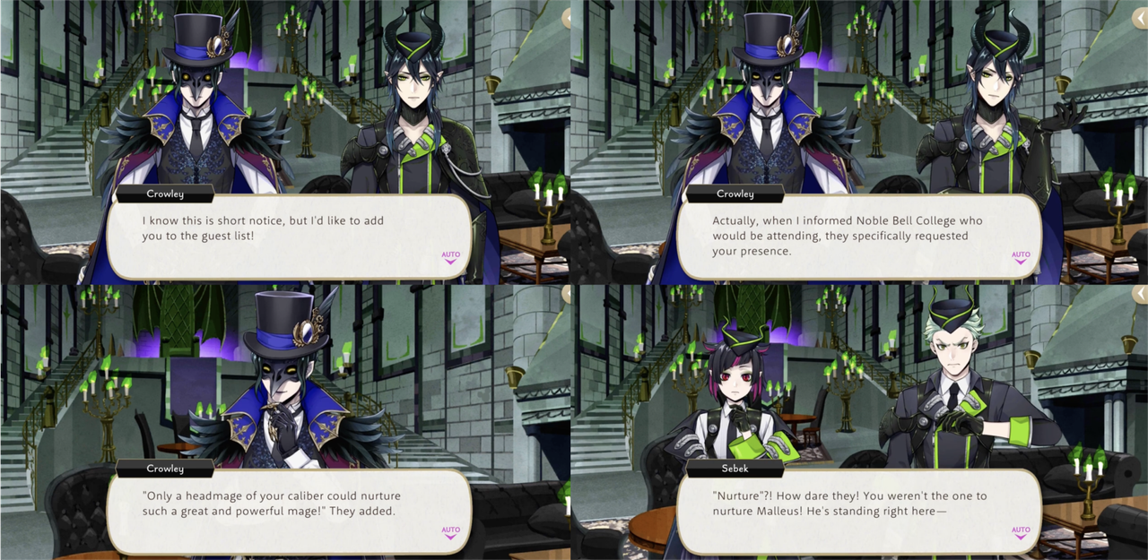When Crowley explains how Noble Bell College flattered him by saying only a headmage of his caliber could have nurtured Malleus Draconia Sebek responds, “You weren’t the one to nurture Malleus! He’s standing right here —“ in reference to Lilia, and after Crowley allows Grim and the prefect to attend Sebek demands that he allow Lilia to join as well.
