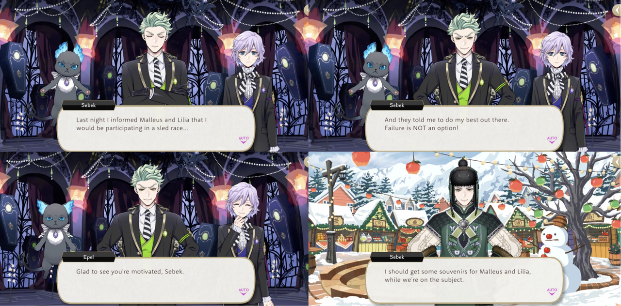 At the start of the Harveston event Sebek declares that failure to win the sled race is not an option, as Malleus and Lilia told him to do his best.
