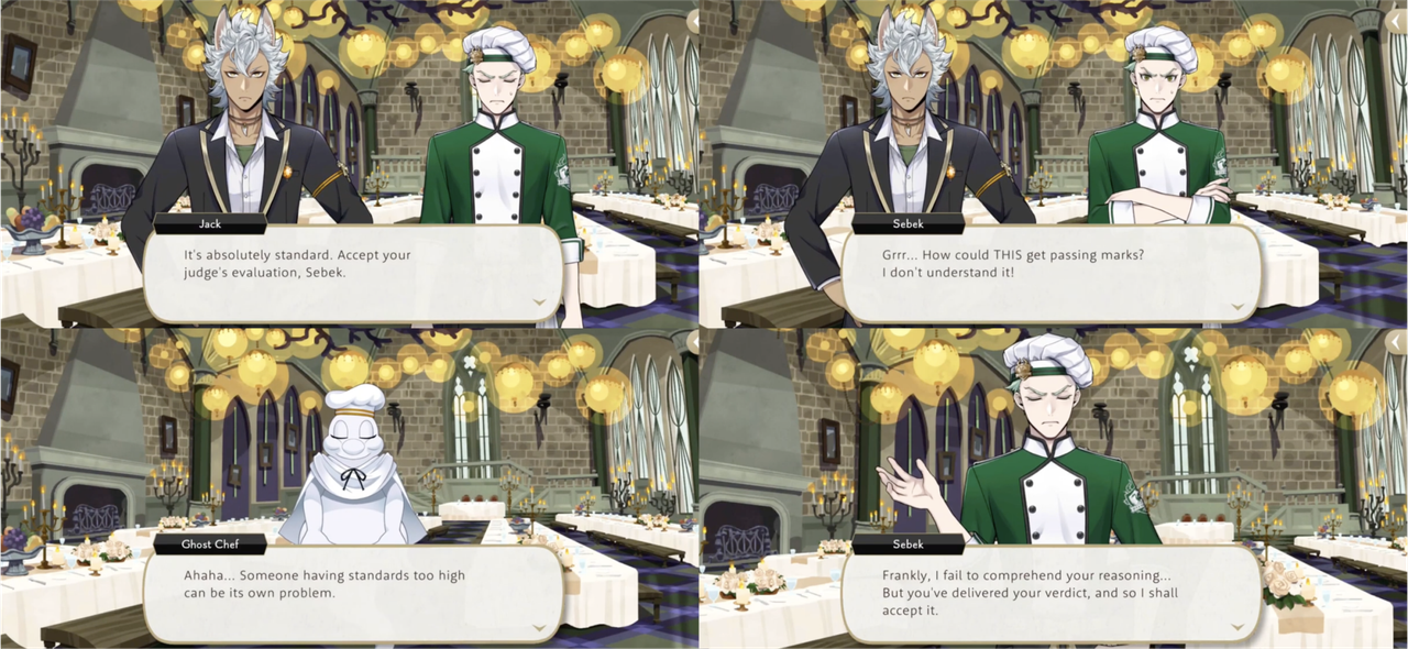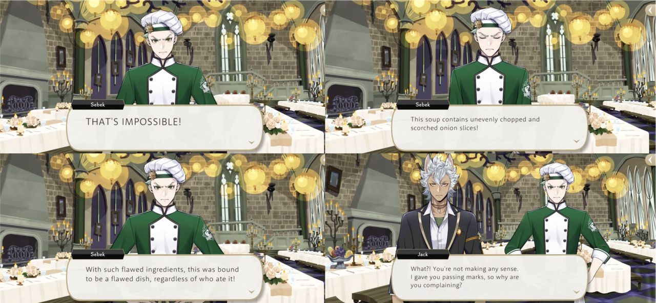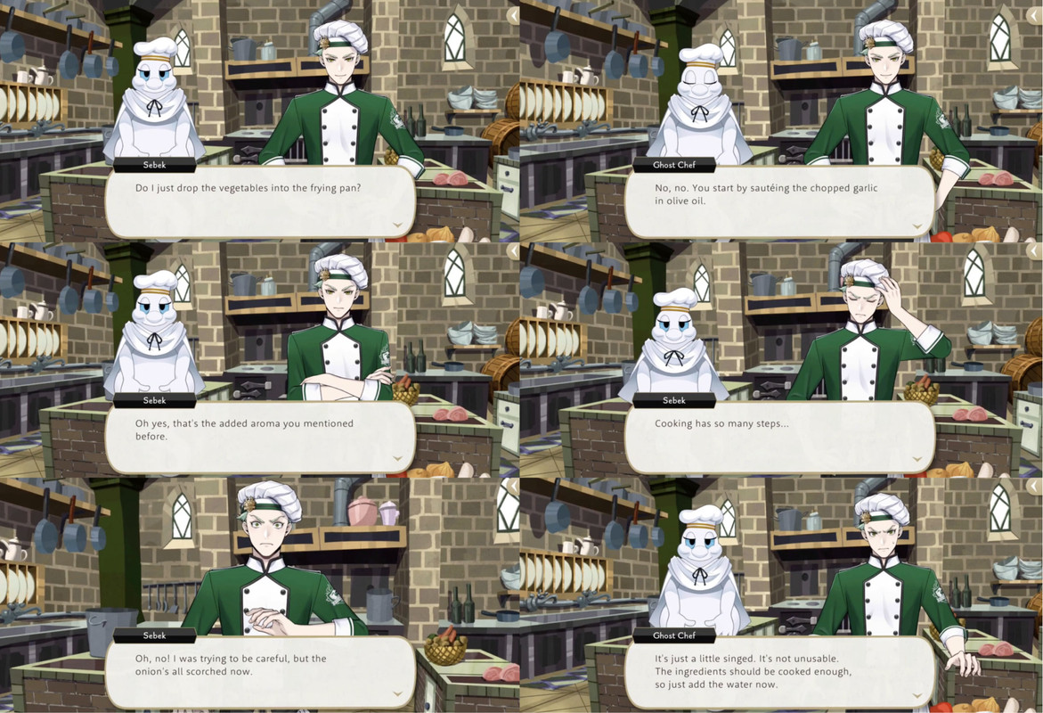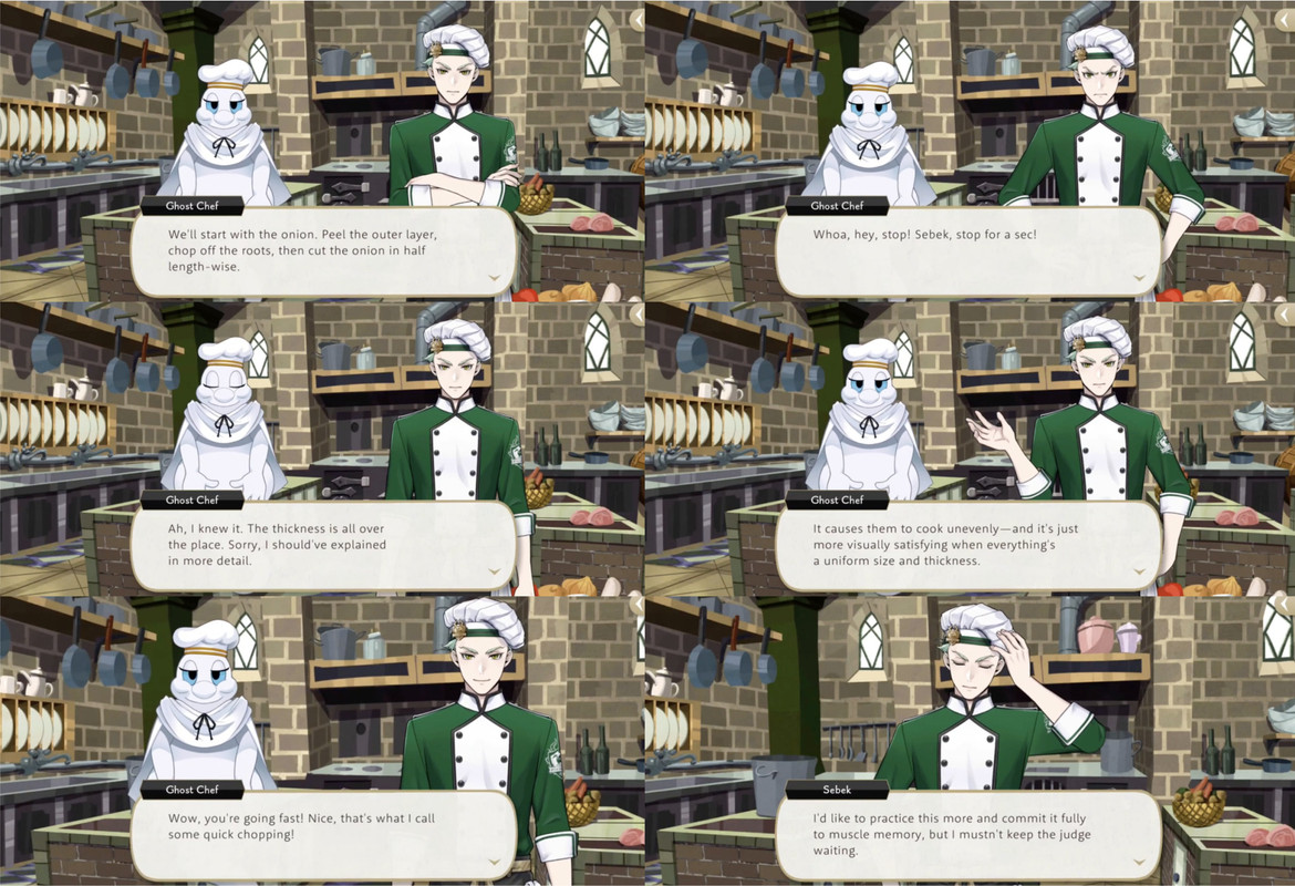 Sebek struggles during the Master Chef course, slicing an onion into wildly varying thicknesses and scorching several bits by accident. The ghost chef assures him it is not unusable and he responds, “Not unusable? Rgh, that means it’s less usable than it was before.”