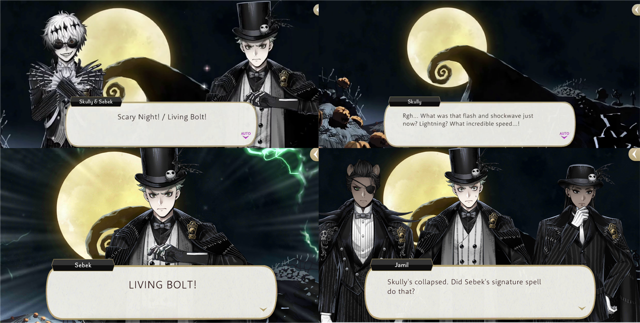 Sebek uses his unique magic twice during the Nightmare Before Christmas event, both times on Skully.