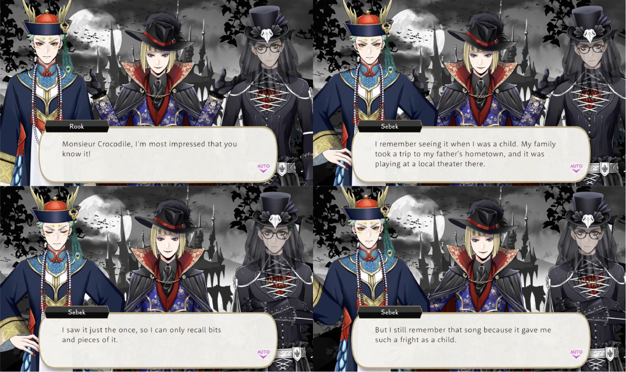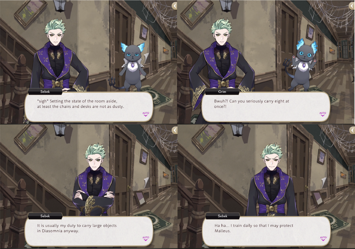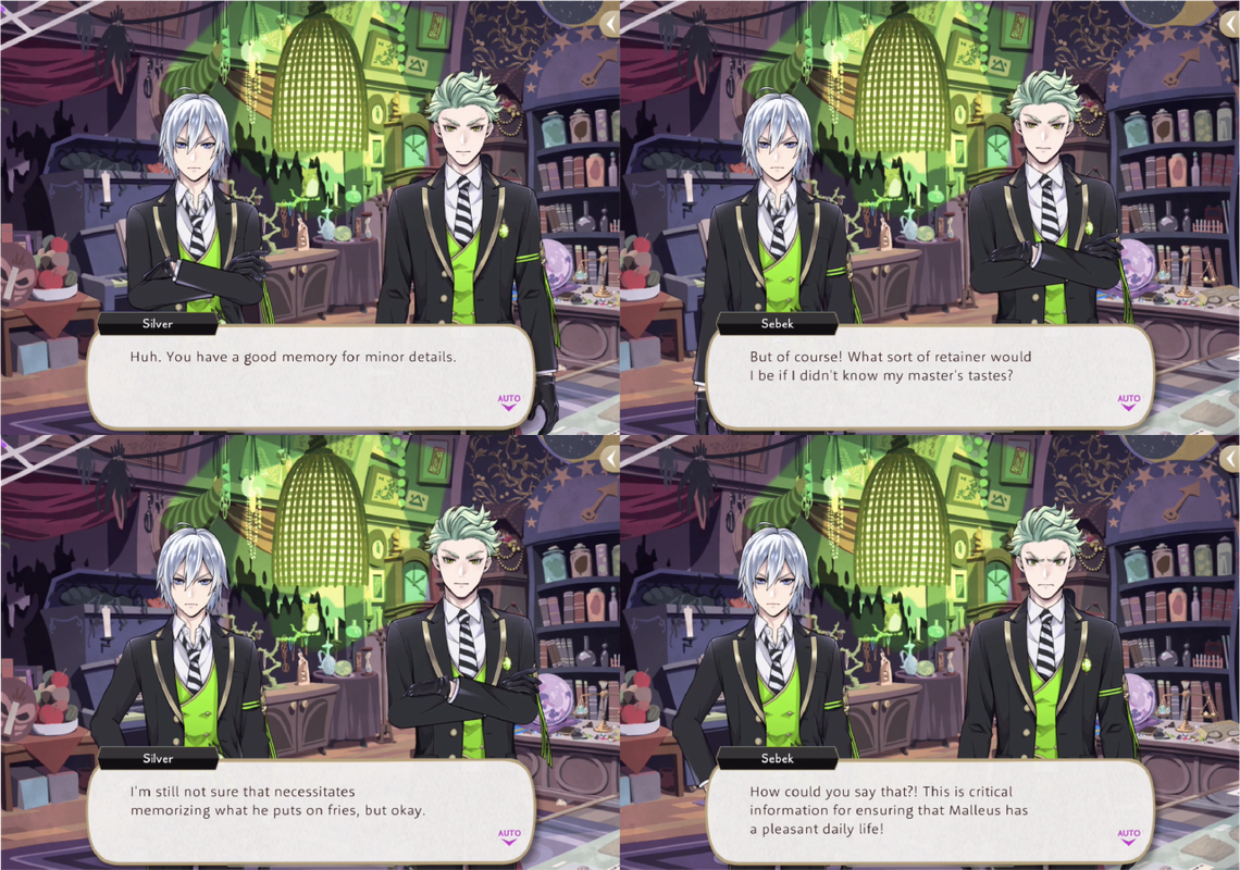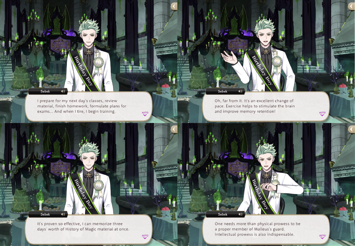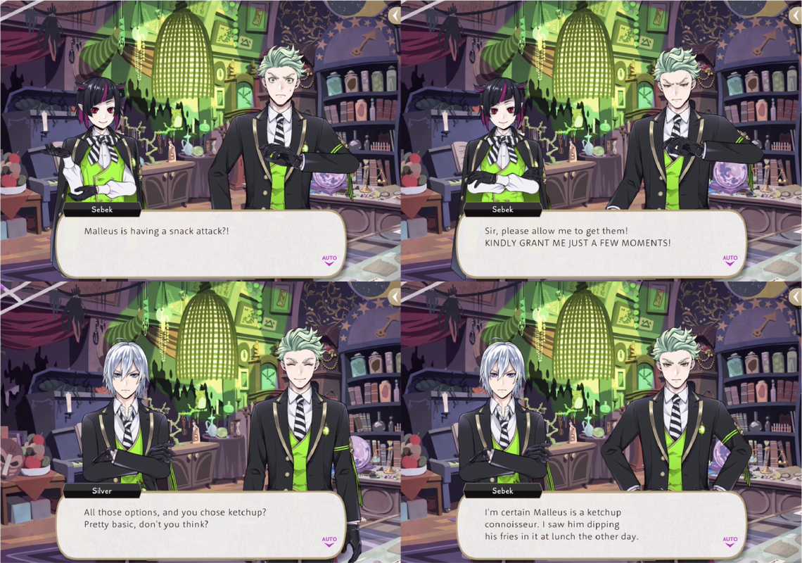 Sebek has a very good memory. Both Trey and Silver compliment him on having “a good memory for minor details” when he is able to memorize the wording of an invitation and recalls seeing Malleus eating French fries with ketchup. Sebek says, “This is critical information for ensuring that Malleus has a pleasant daily life!”