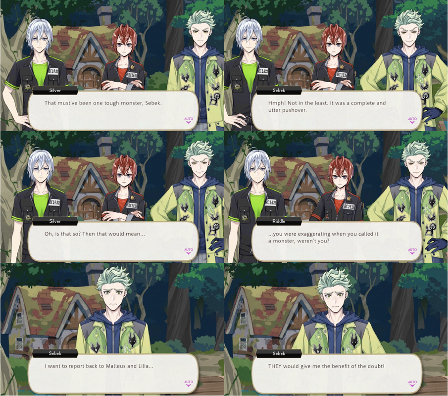 This confidence hurts his credibility in the end, however, when Riddle and Silver will not believe that he fought a monster at all after he describes it as “a complete and utter pushover”. Sebek declares he wants to report back to Malleus and Lilia instead, as “they would give me the benefit of the doubt!”